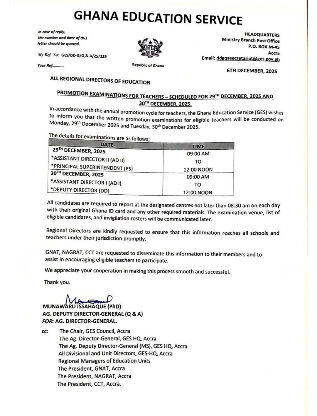 The Ghana Education Service (GES) has announced that the 2025 promotion examinations for eligible teaching staff will take place on Monday, December 29, and Tuesday, December 30, 2025.