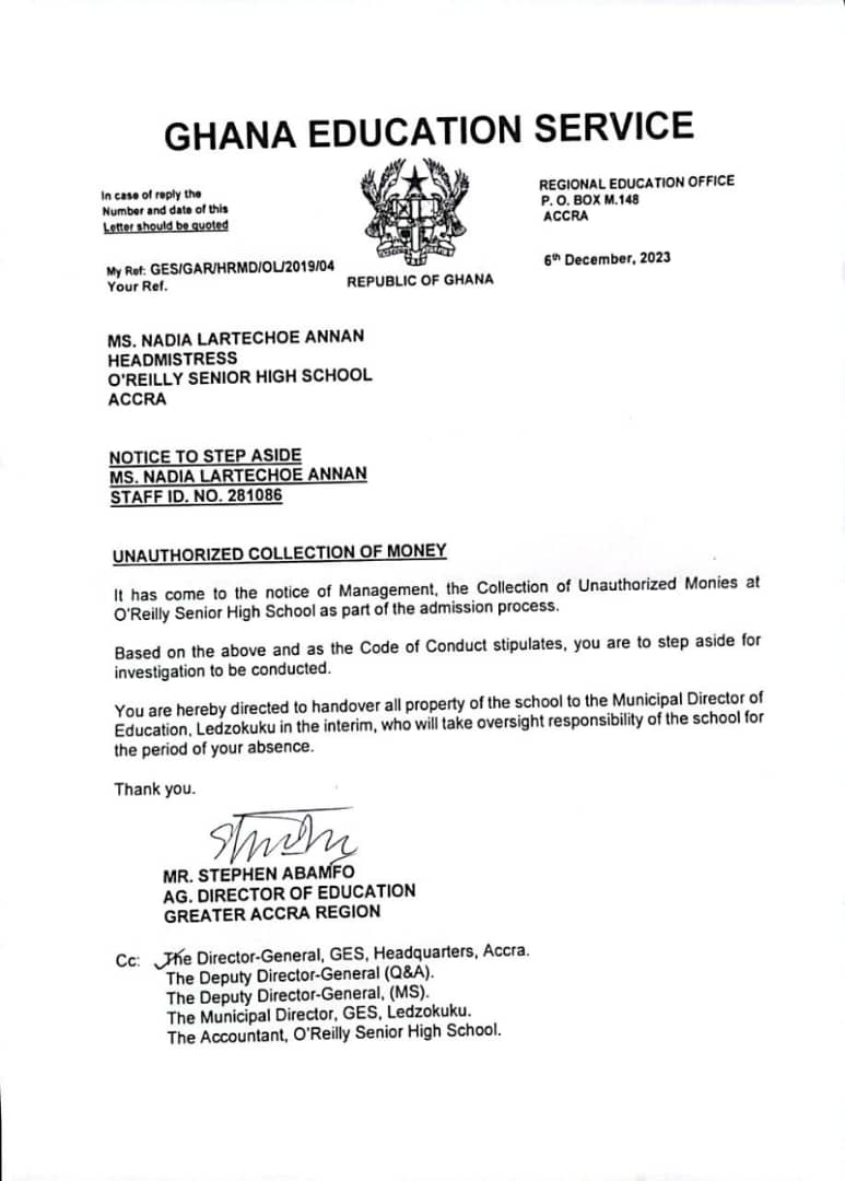 In a letter dated December 6, 2023, the GES directed Nadia Lartechoe Annan, the headmistress of O’Reilly SHS to step aside pending an investigation, citing the violation of the school’s Code of Conduct.