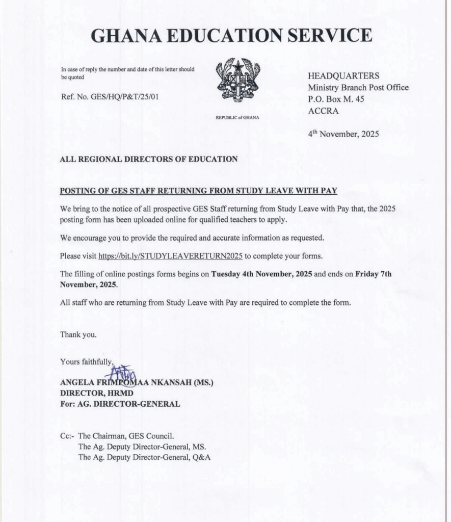 In a circular dated November 4, 2025, the GES has informed all Regional Directors of Education that the 2025 posting form for staff returning from Study Leave with Pay has been uploaded online for eligible teachers to apply.