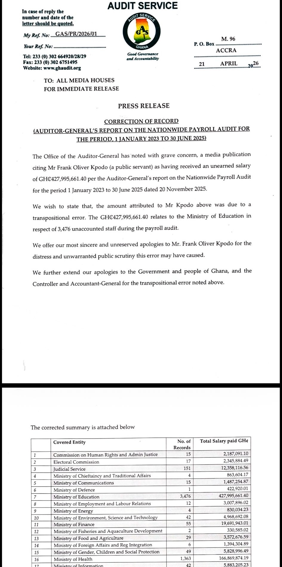 The Office of the Auditor-General has issued an apology after a major error in its nationwide payroll audit report wrongly linked a public servant to an unearned salary of over GH¢427 million.
