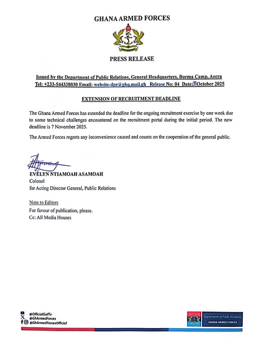 “The Ghana Armed Forces has extended the deadline for the ongoing recruitment exercise by one week due to some technical challenges encountered on the recruitment portal during the initial period,” the statement read.