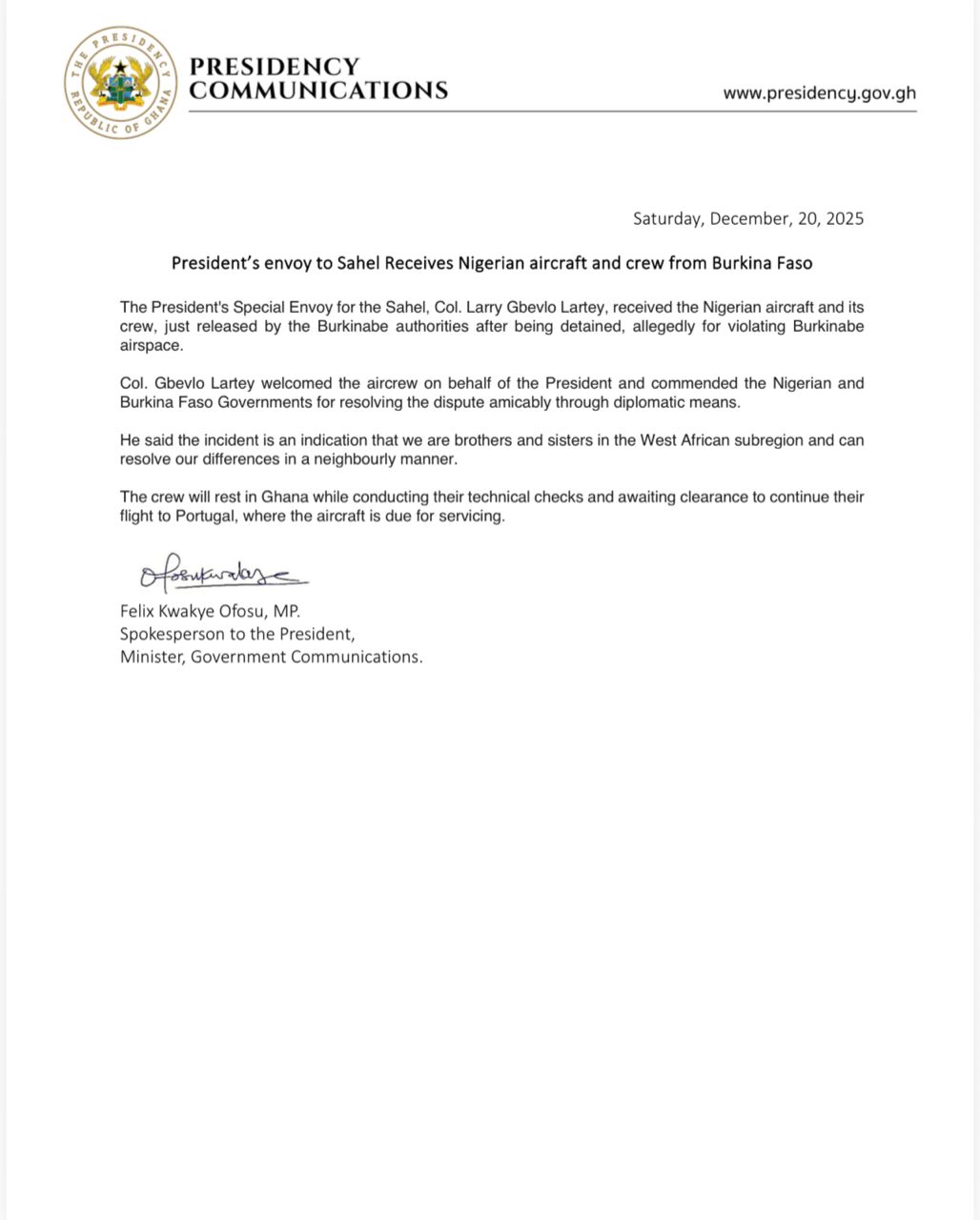 In a statement released the same day, Col. Lartey commended both the Nigerian and Burkina Faso governments for their constructive collaboration, which he said prevented the incident from escalating into a diplomatic conflict.