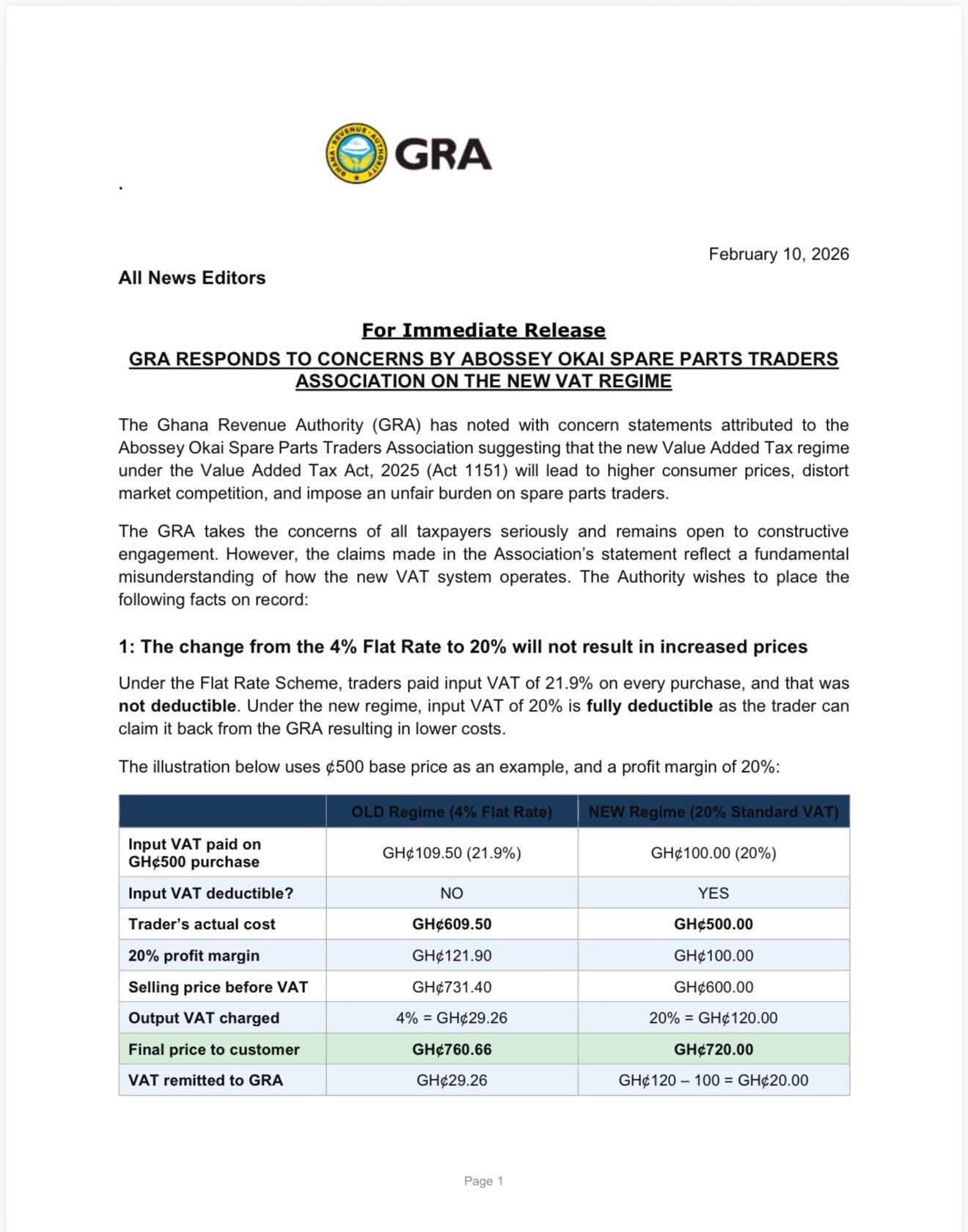 The Ghana Revenue Authority (GRA) has provided further clarification on the implementation of the new 20 per cent Value Added Tax (VAT) rate.