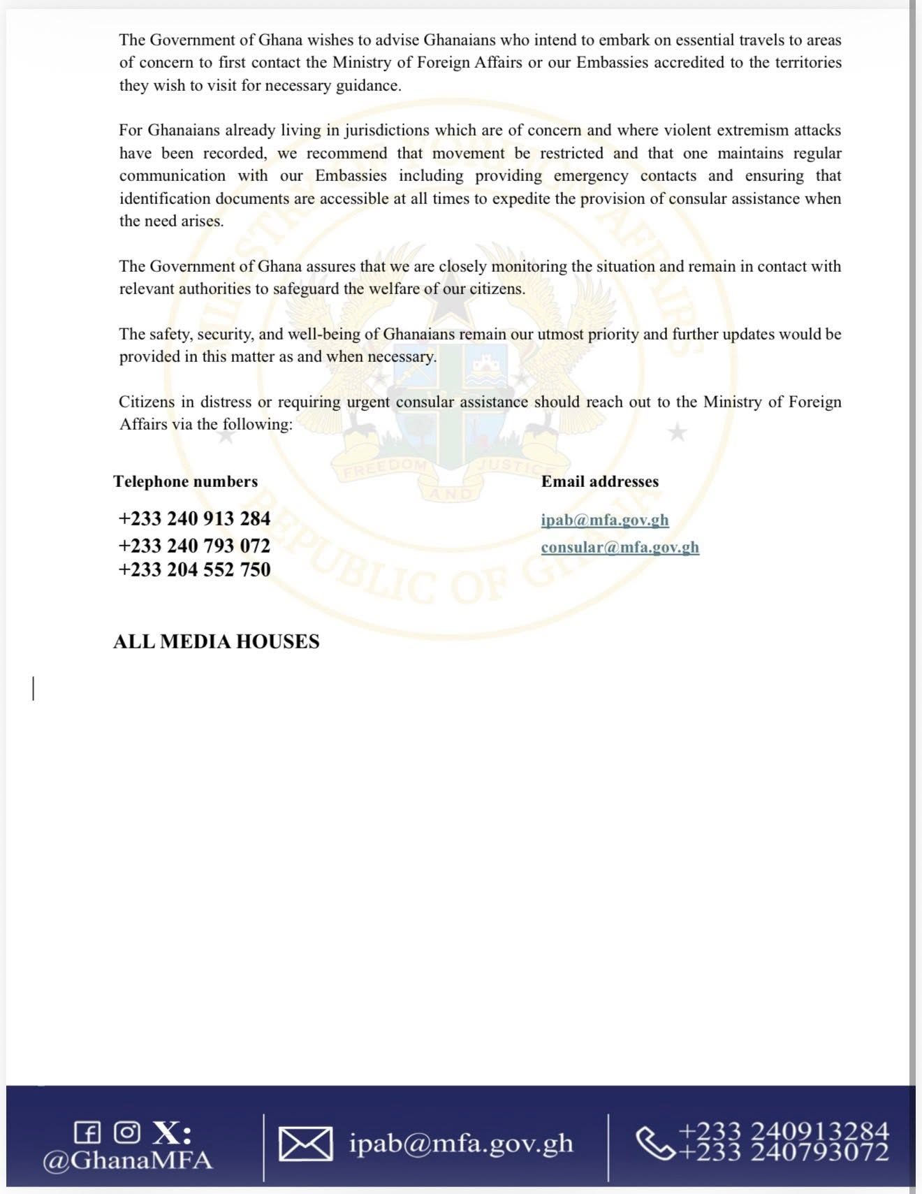 For Ghanaians already living in jurisdictions where violent extremist attacks have been recorded, the Ministry recommended restricting movement and maintaining regular communication with Ghanaian missions. Citizens have also been encouraged to provide emergency contact details and ensure that identification documents are accessible at all times to facilitate consular support when needed.