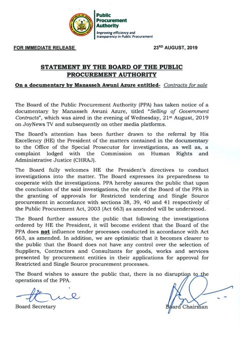 "The Board expresses its preparedness to cooperate with the investigations. PPA hereby assures the public that upon the conclusion of the said investigations, the role of the Board of the PPA in the granting of approvals for Restricted tendering and Single Source procurement in accordance with sections 38, 39, 40 and 41 respectively of the Public Procurement Act, 2003 (Act 663] as amended will be understood.