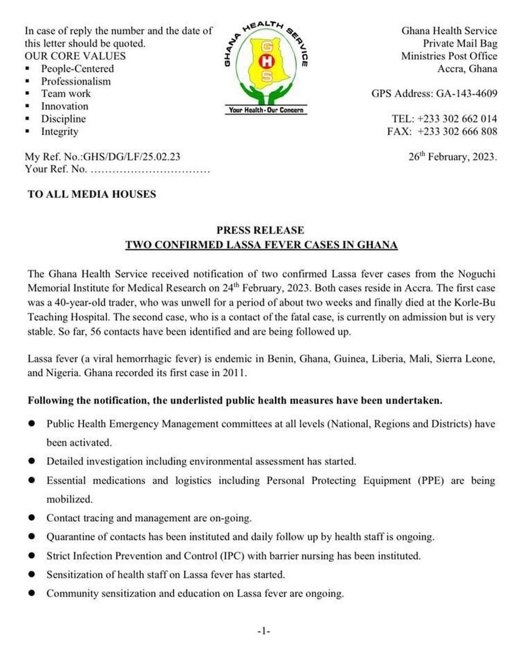 Two cases of Lassa fever have been recorded in Accra as confirmed by the Ghana Health Service (GHS)after tests by the Noguchi Memorial Institute for Medical Research.