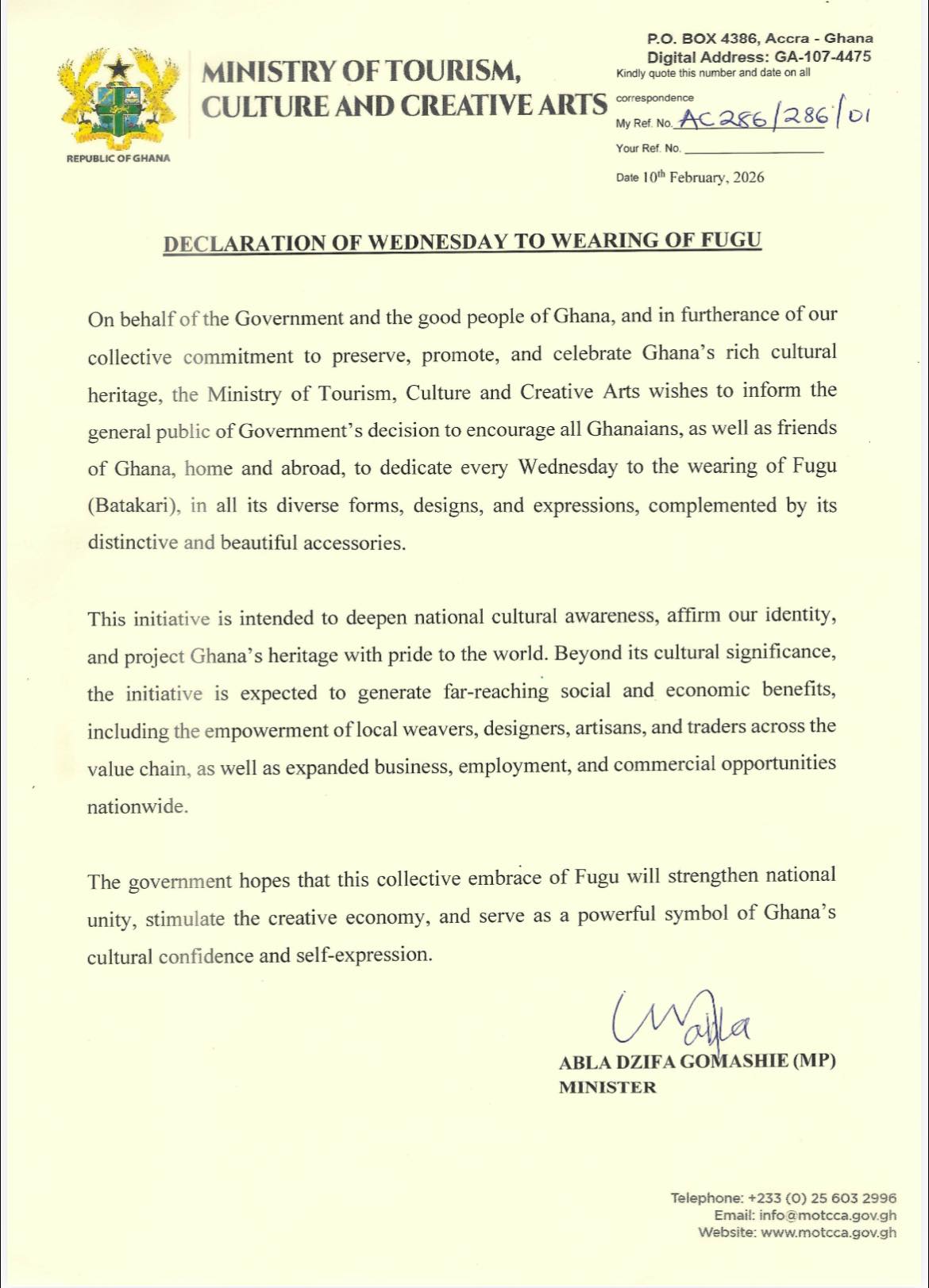 The Government has declared Wednesdays as a national day for the wearing of Fugu, also known as Batakari, as part of efforts to promote Ghana’s cultural heritage and strengthen the creative economy.