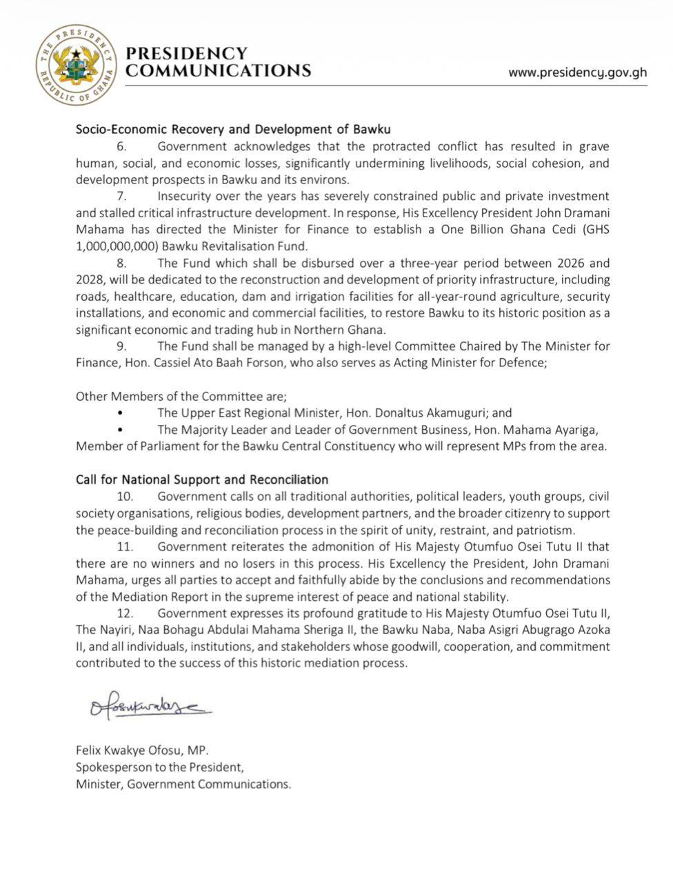 The statement was signed by the Minister for Government Communications and Presidential Spokesperson, Felix Kwakye Ofosu.
