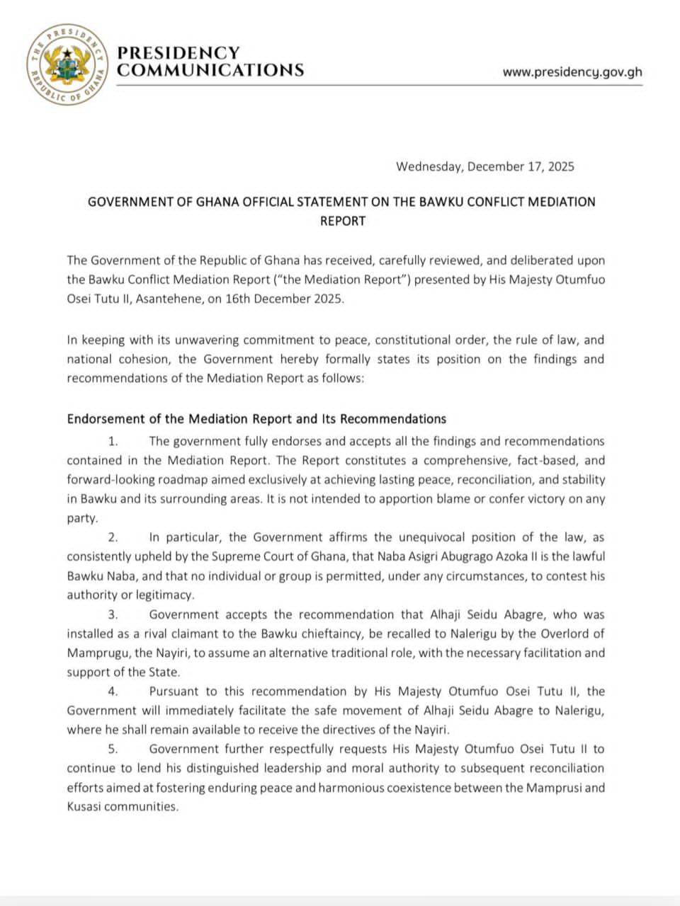 The statement also expressed government’s appreciation to Otumfuo Osei Tutu II, the Nayiri, the Bawku Naba, and all stakeholders who contributed to the mediation process.