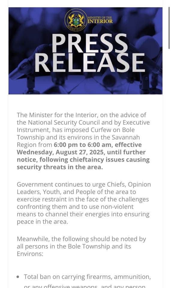 The curfew comes amid heightened security operations in the Savannah Region as authorities seek to prevent escalation of long-standing land-related disputes.