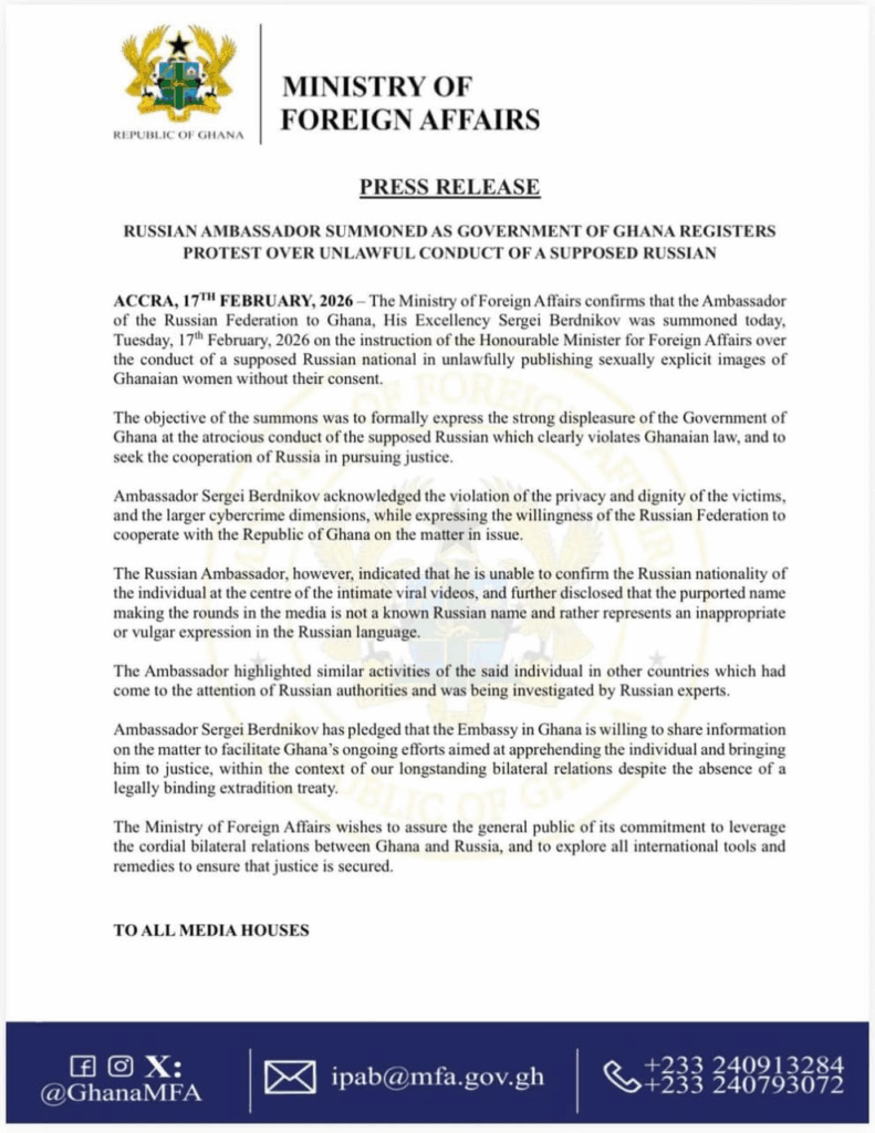 The Ministry of Foreign Affairs has summoned the Russian Ambassador to Ghana, Sergei Berdnikov, over what it has described as the unlawful circulation of sexually explicit images of Ghanaian women without their consent.