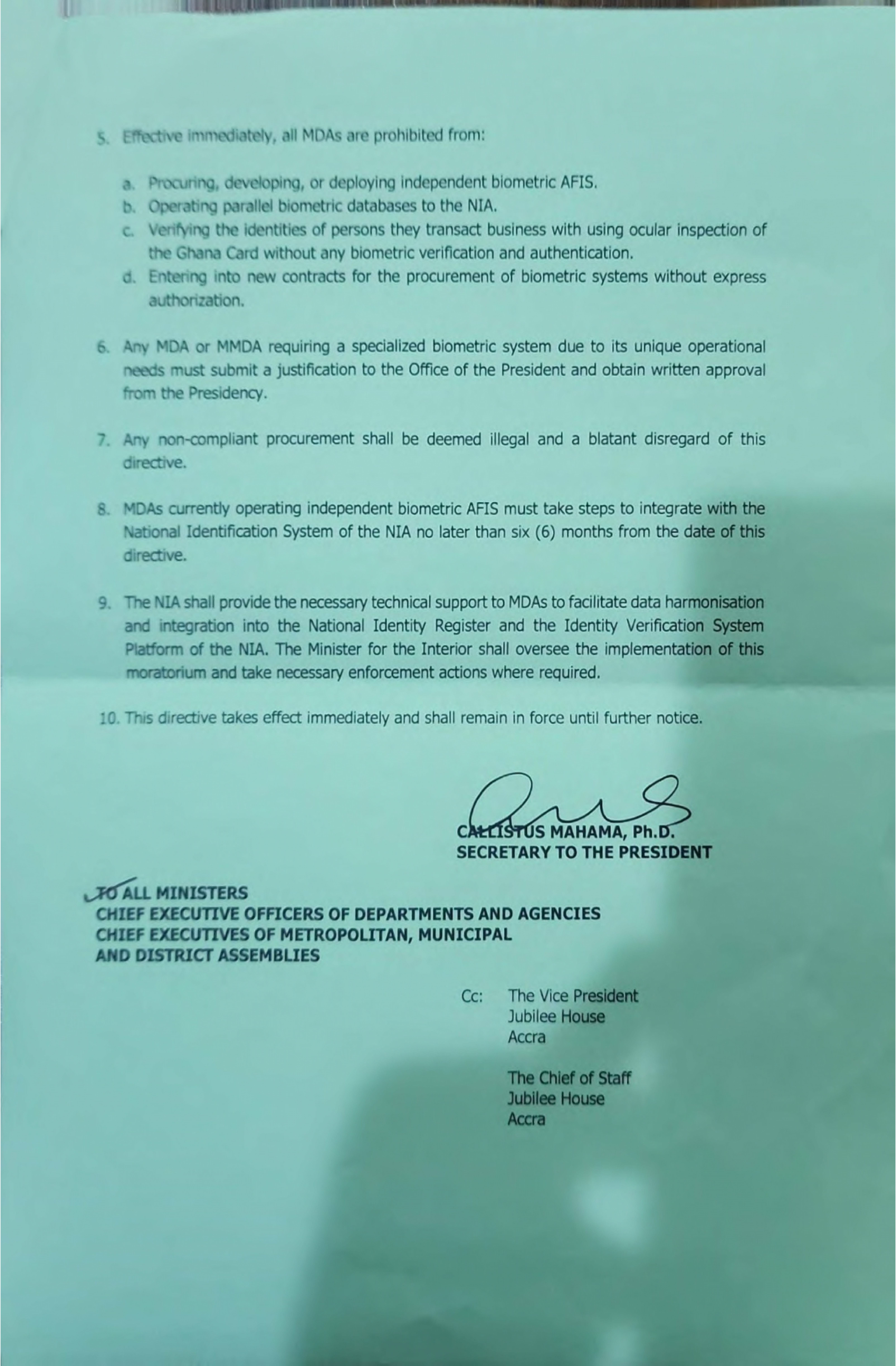 The directive, issued by the Secretary to the President, Callistus Mahama, forms part of government’s efforts to promote data security, resource efficiency, and standardisation of biometric identification systems across public institutions.