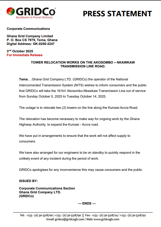 The Ghana Grid Company Limited (GRIDCo) has announced that it will take the 161kV Akosombo–Nkawkaw transmission line out of service from Sunday, October 5, to Tuesday, October 14, 2025.