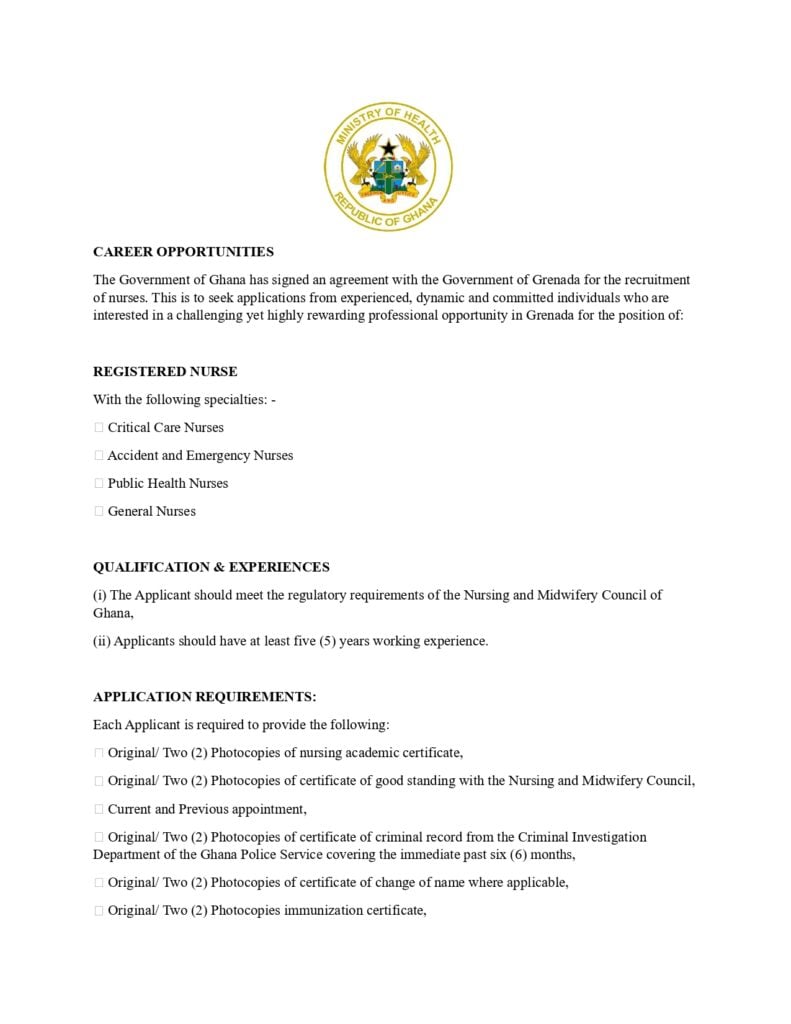 The Ministry of Health has opened applications for Ghanaian nurses interested in working in Grenada.