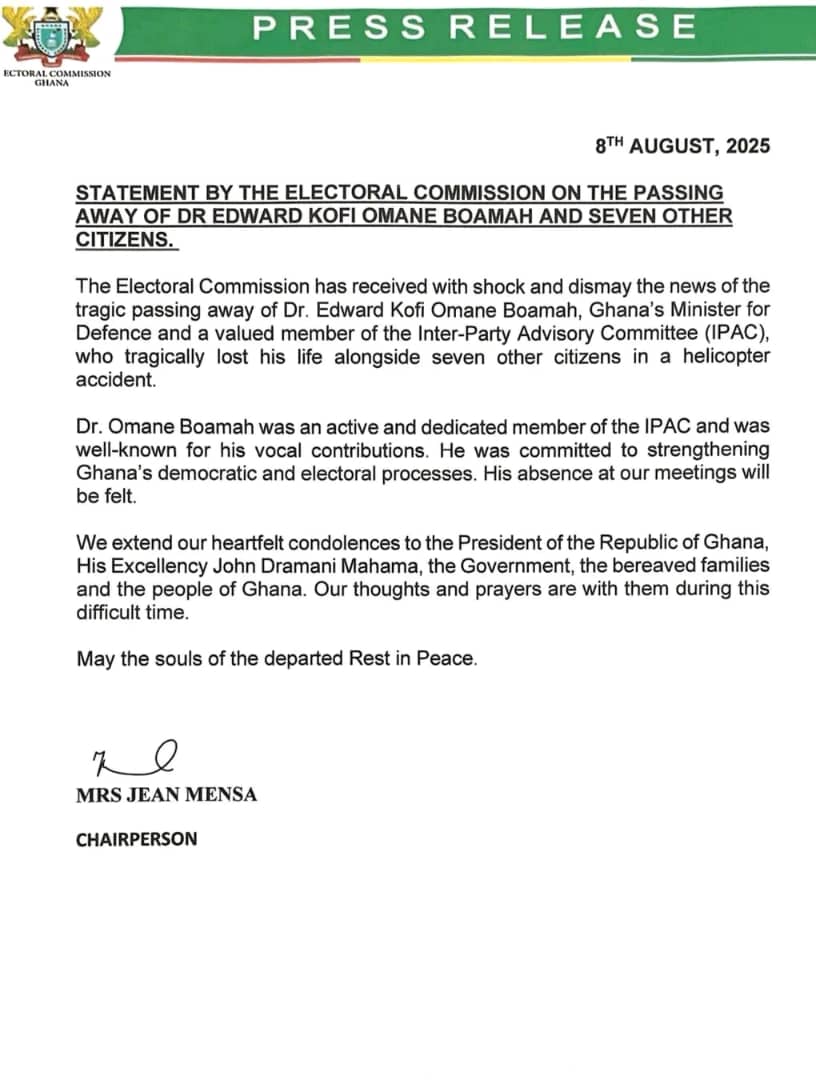 In a statement issued on Friday, EC Chairperson Jean Mensa described the news as shocking and disheartening, given Dr. Boamah’s role as a dedicated and vocal member of the Inter-Party Advisory Committee (IPAC).