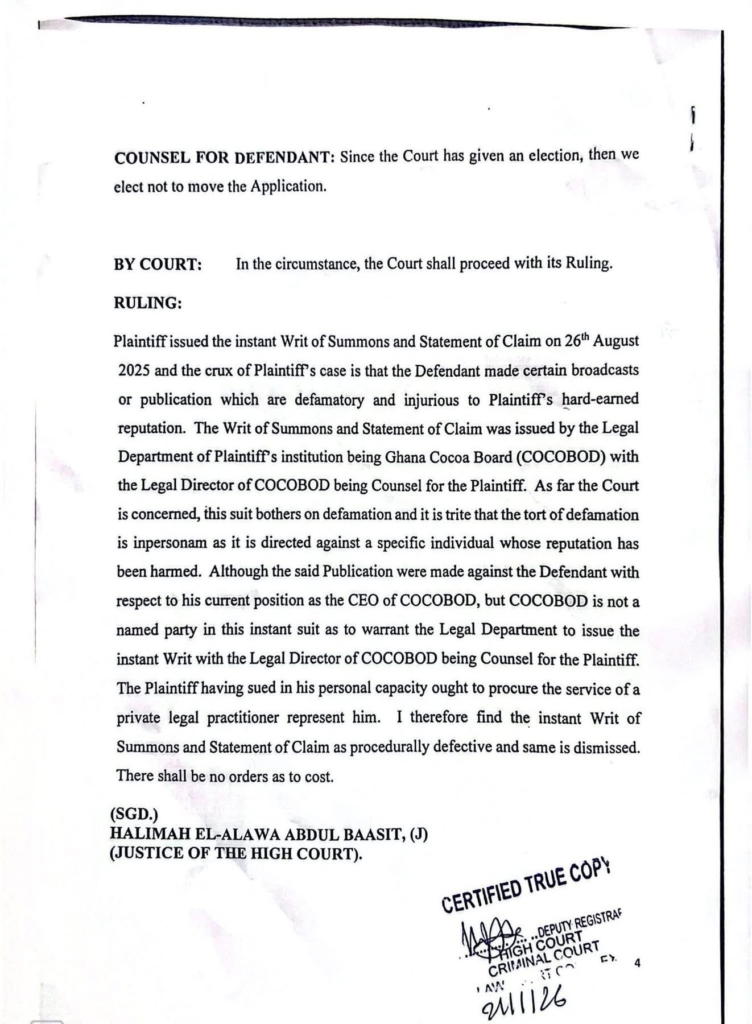 The High Court in Accra has dismissed a defamation suit filed by the Chief Executive Officer of COCOBOD, Dr. Ransford Anertey Abbey, against Bono Regional New Patriotic Party (NPP) Chairman Kwame Baffoe Abronye, ruling that the case was improperly instituted.