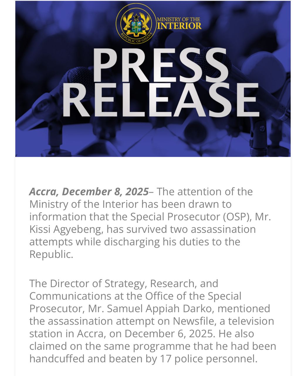 Given the gravity of the claims, the Minister for the Interior has ordered a full-scale probe into both matters. The first investigation will focus on the alleged assassination attempts against Mr. Agyebeng, with the Ministry stressing that crimes of such nature do not expire. A second inquiry will examine the allegation by Mr. Appiah Darko that he was assaulted by multiple police officers.