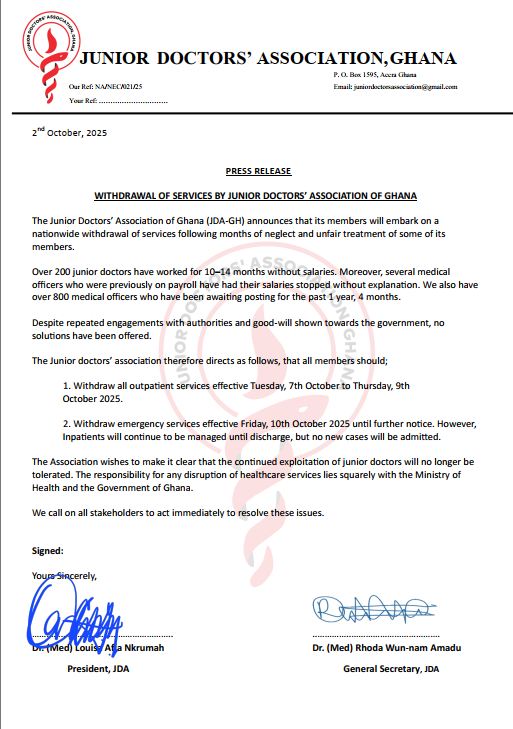 The Junior Doctors’ Association of Ghana (JDA-GH) says its members will withdraw their services nationwide following what they describe as months of neglect and unfair treatment.