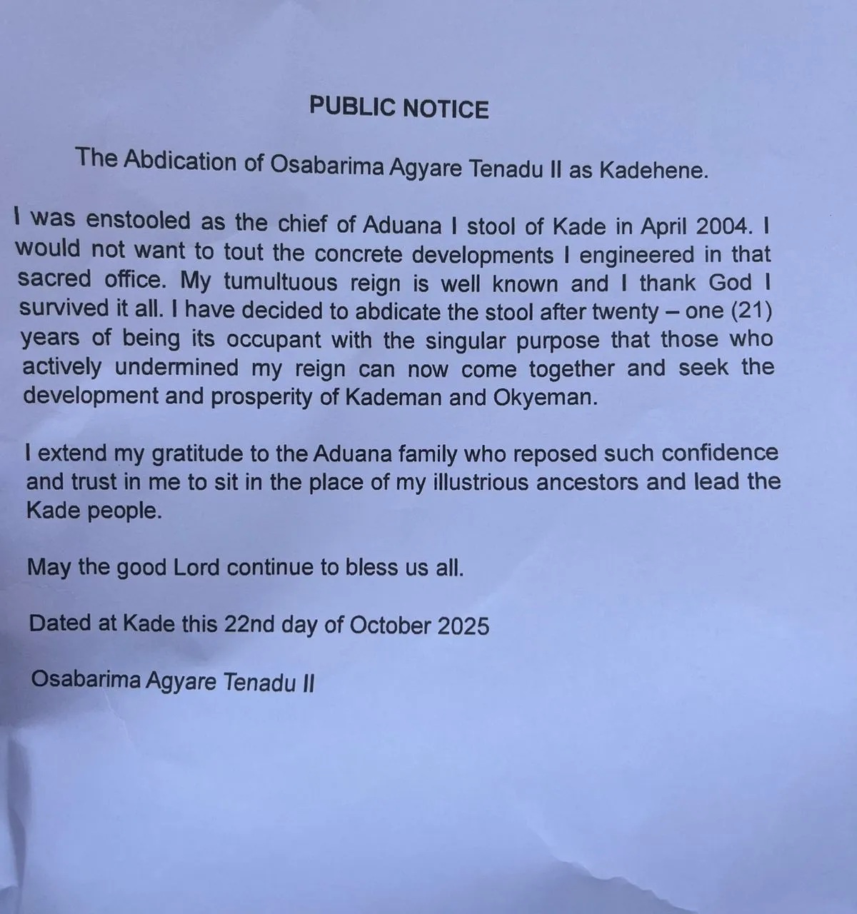 “I have decided to abdicate the stool after 21 years of being its occupant with the singular purpose that those who actively undermined my reign can now come together and seek the development and prosperity of Kademan and Okyenman.”