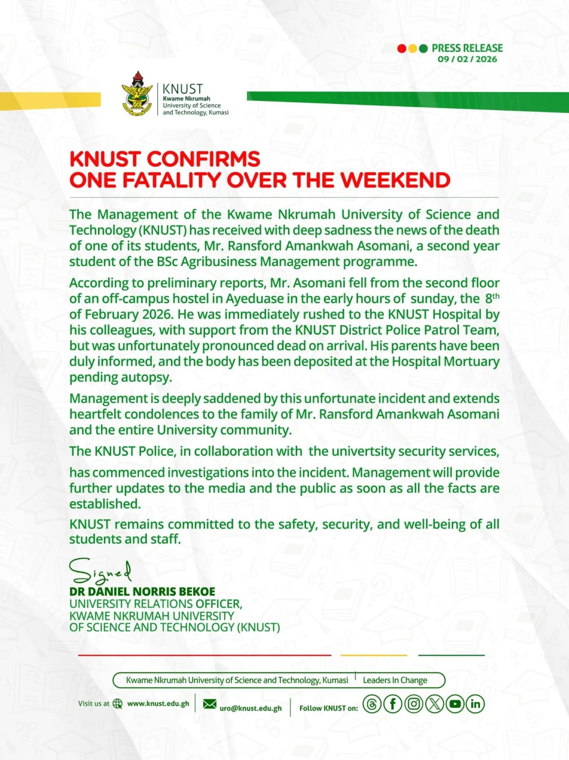 The KNUST Police and university security are investigating, and updates will be provided once all facts are established.