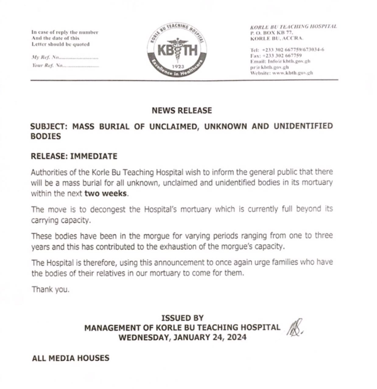 The Korle Bu Teaching Hospital has announced it will hold a mass burial for all unknown, unidentified and unclaimed bodies in its mortuary.