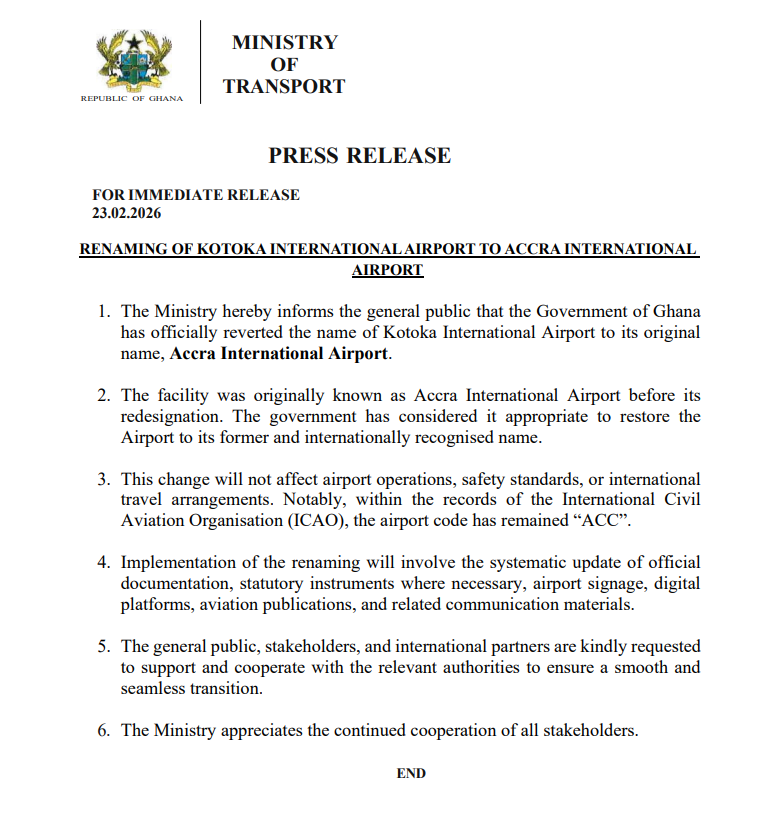 In a statement issued by the Transport Ministry on Monday February 23, the government explained that the airport was originally known as Accra International Airport before it was later renamed.
