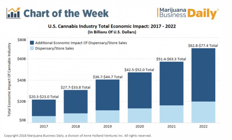 Also, the daily said estimates published in the newly-released Marijuana Business Factbook show the total economic impact of legal marijuana sales increased from $20 billion – $23 billion in 2017 to $63 billion – $77 billion by 2022 – a 223% increase.