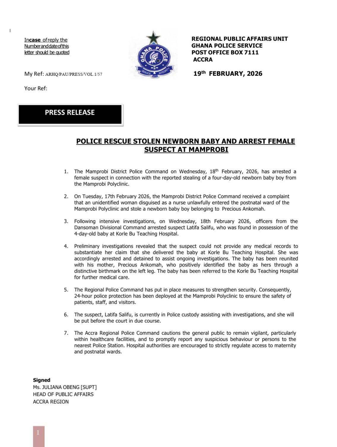 According to police, at around 10 a.m. on February 17, Abigail Dzikunu, accompanied by Henrita Abe Blessed, reported “that an unidentified woman, disguised as a nurse, had stolen a newborn from the hospital’s postnatal ward.”