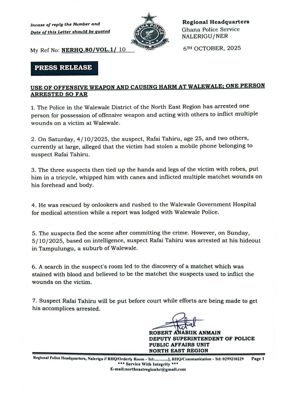 A press release by the Police states that on Saturday, October 4, 2025, the suspect Rafai Tahiru, age 25, and two others currently at large, allegedly attacked a victim, claiming the victim had stolen a mobile phone belonging to Tahiru.