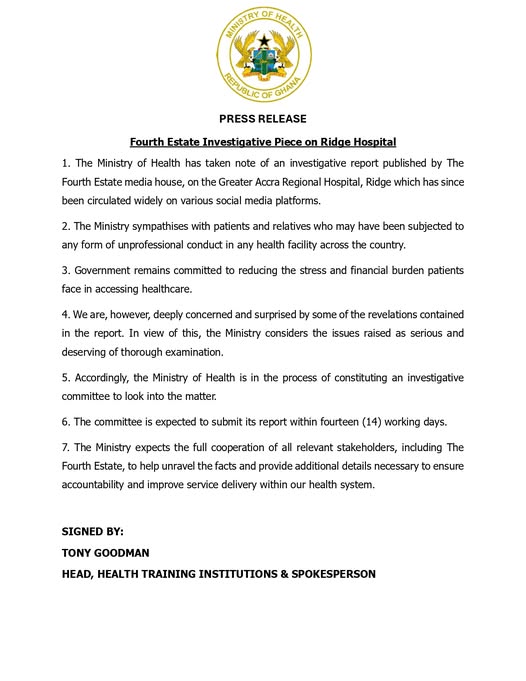 The Ministry of Health has announced that it will investigate concerns raised in an investigative report by The Fourth Estate regarding operations at the Greater Accra Regional Hospital, commonly known as Ridge Hospital.