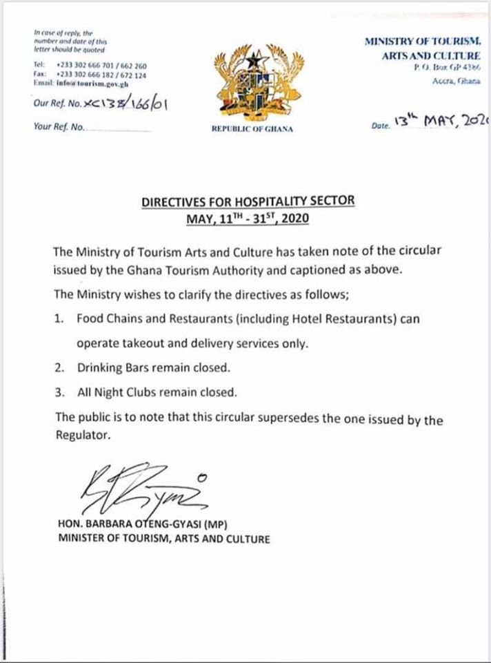 The Ghana Tourism Authority earlier directed drinking bars to begin business but observe strict social distancing protocols.