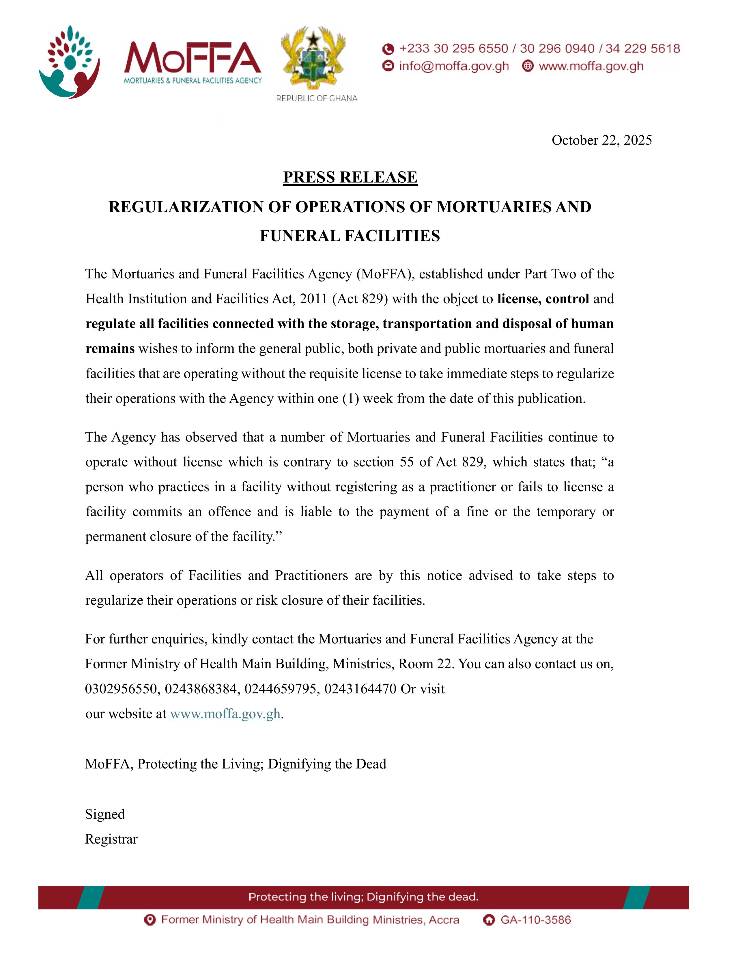 “The Mortuaries and Funeral Facilities Agency (MoFFA), established under Part Two of the Health Institution and Facilities Act, 2011 (Act 829) with the object to license, control and regulate all facilities connected with the storage, transportation and disposal of human remains wishes to inform the general public, both private and public mortuaries and funeral facilities that are operating without the requisite license to take immediate steps to regularize their operations with the Agency within one (1) week from the date of this publication,” parts of the statement read.