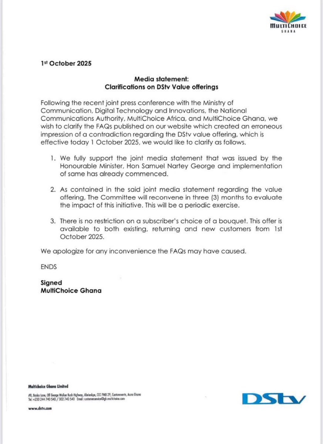 It noted that the said promotion will run from October 1, 2025, to December 31, 2025, contradicting earlier announcements by the Minister for Communication, Digital Technology, and Innovations, Samuel Nartey George, that this was a permanent renegotiated arrangement with MultiChoice Africa to give Ghanaians value for money.