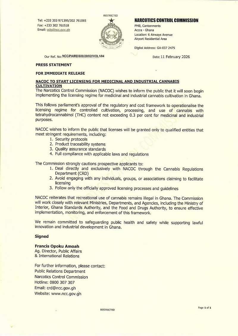 The Narcotics Control Commission (NACOC) has announced plans to implement a licensing regime for medicinal and industrial cannabis cultivation in Ghana.