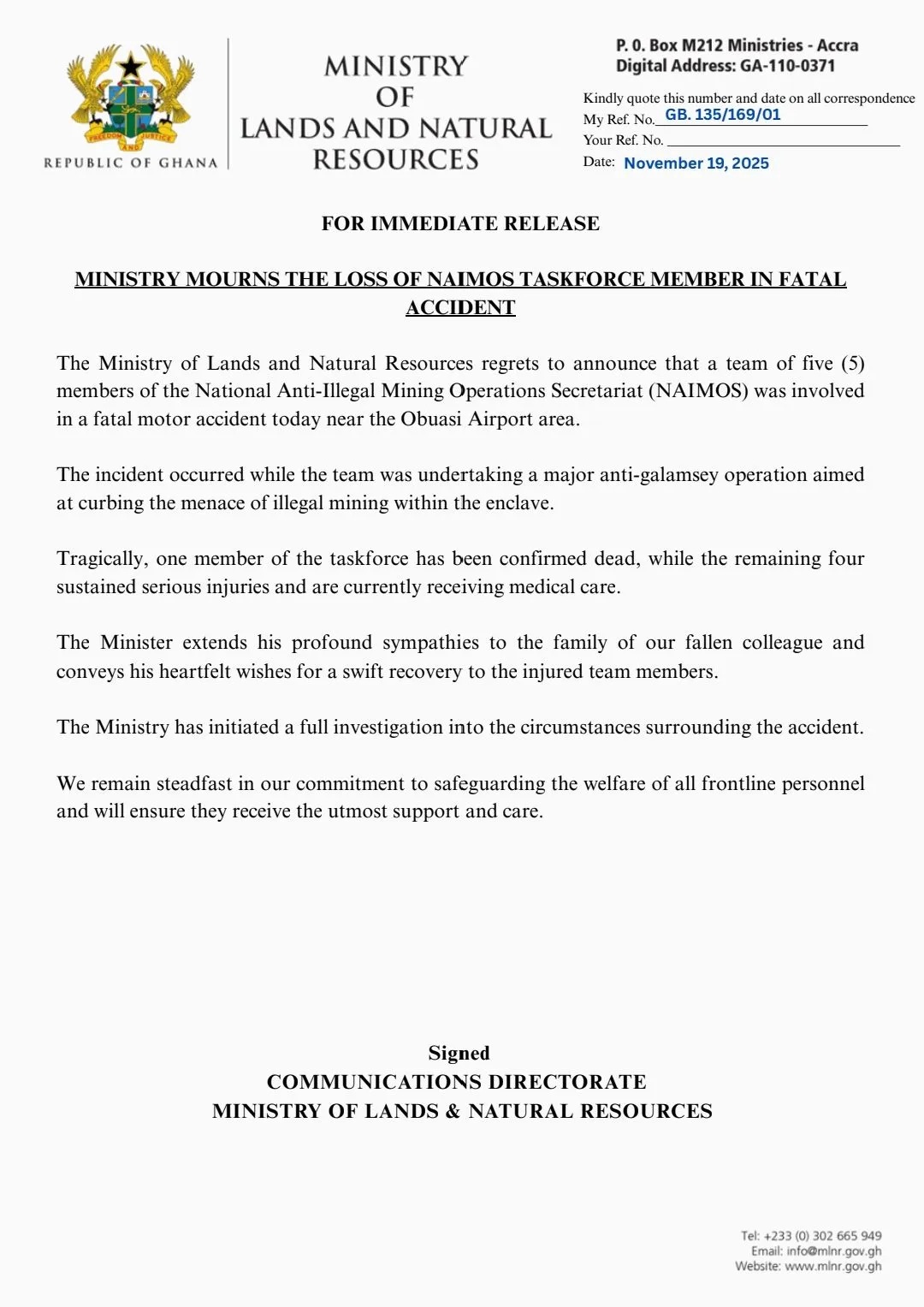 In a statement issued, the Ministry of Lands and Natural Resources said the accident occurred during a major anti-galamsey operation aimed at clamping down on illegal mining activities within the enclave.