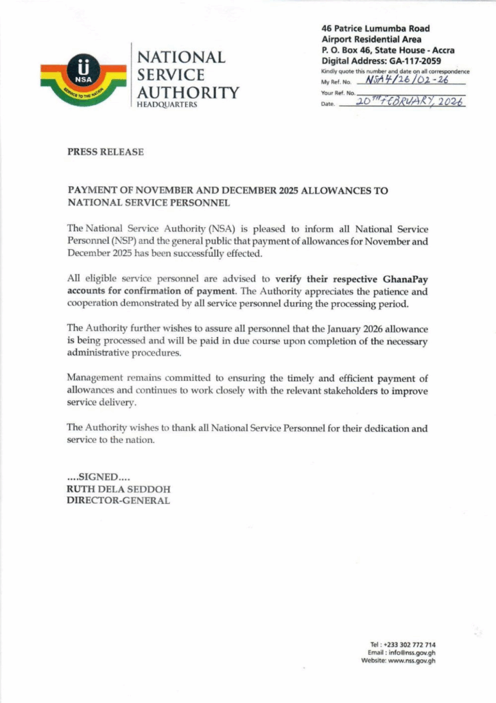 The National Service Authority has announced that allowances for November and December 2025 have been paid to national service personnel across the country.