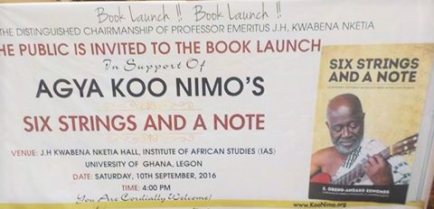 The brand new biographical book, "Six Strings and a Note", which chronicles the life of the famous original palmwine Highlife Maestro, Koo Nimo (born Kwabena Boa-Amponsem on October 3, 1934 and baptized Daniel Amponsah) has been launched at the Institute of African Studies (IAS), University of Ghana-Legon.