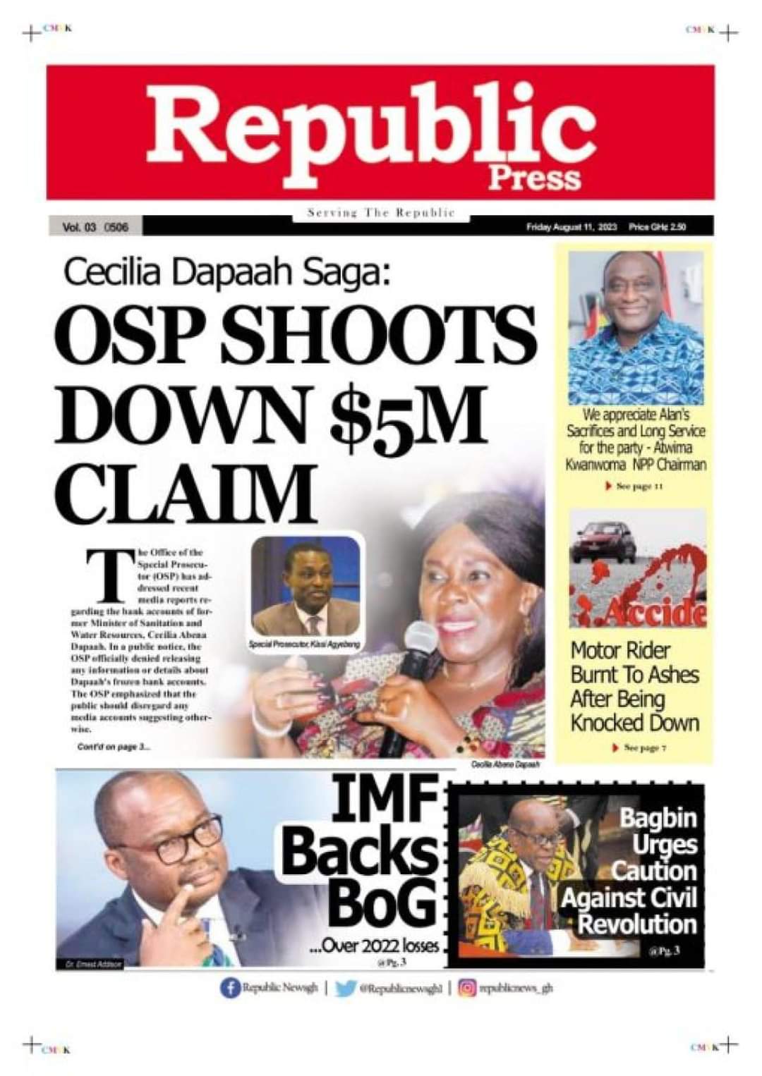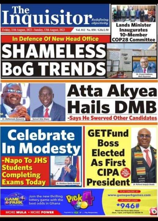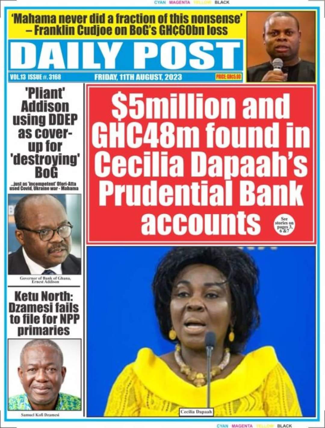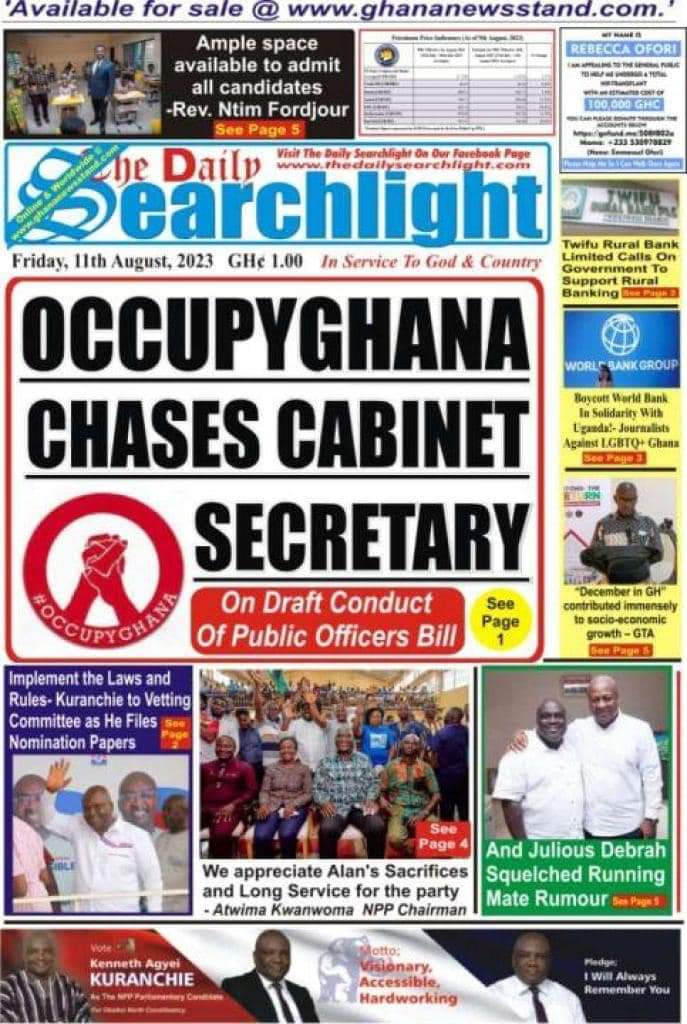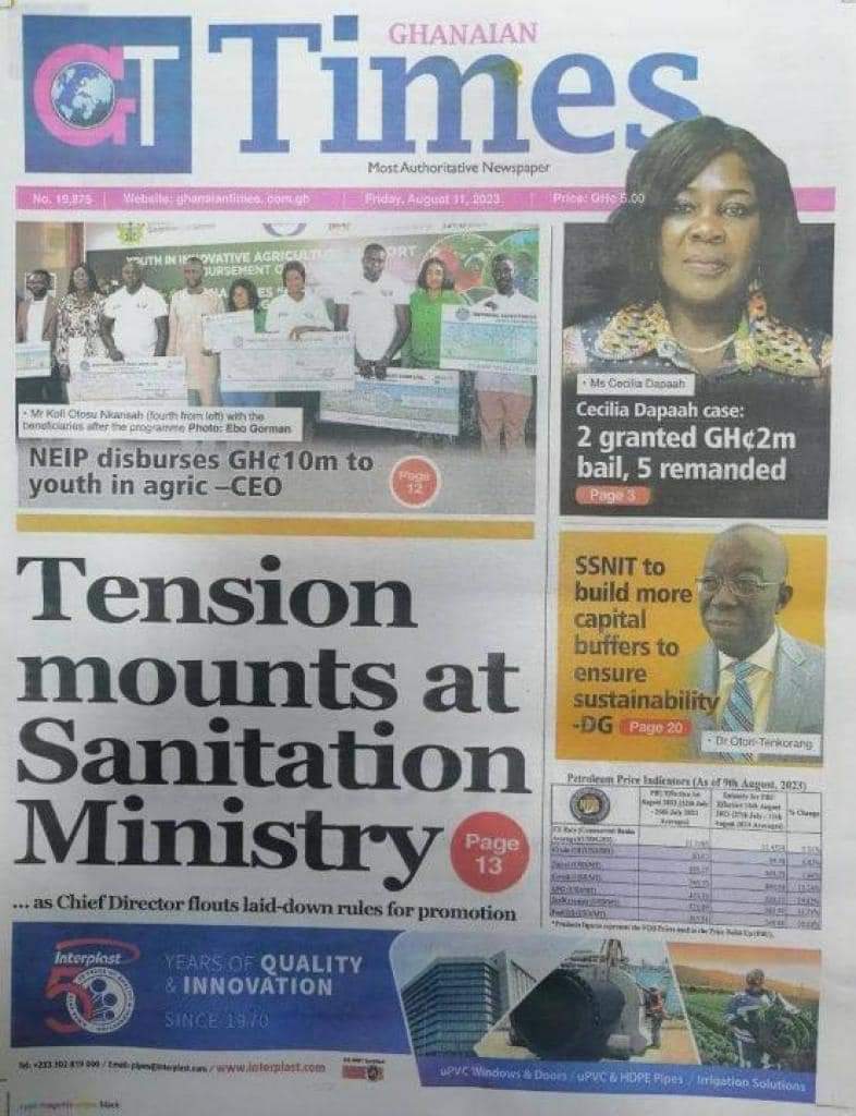 Newspaper headlines: Friday, August 11, 2023 Date: 11 August 2023 By Vincent Ashitey Category: general news Shares Share Tweet Email Share Here are the front pages of some of Ghana’s newspapers today.