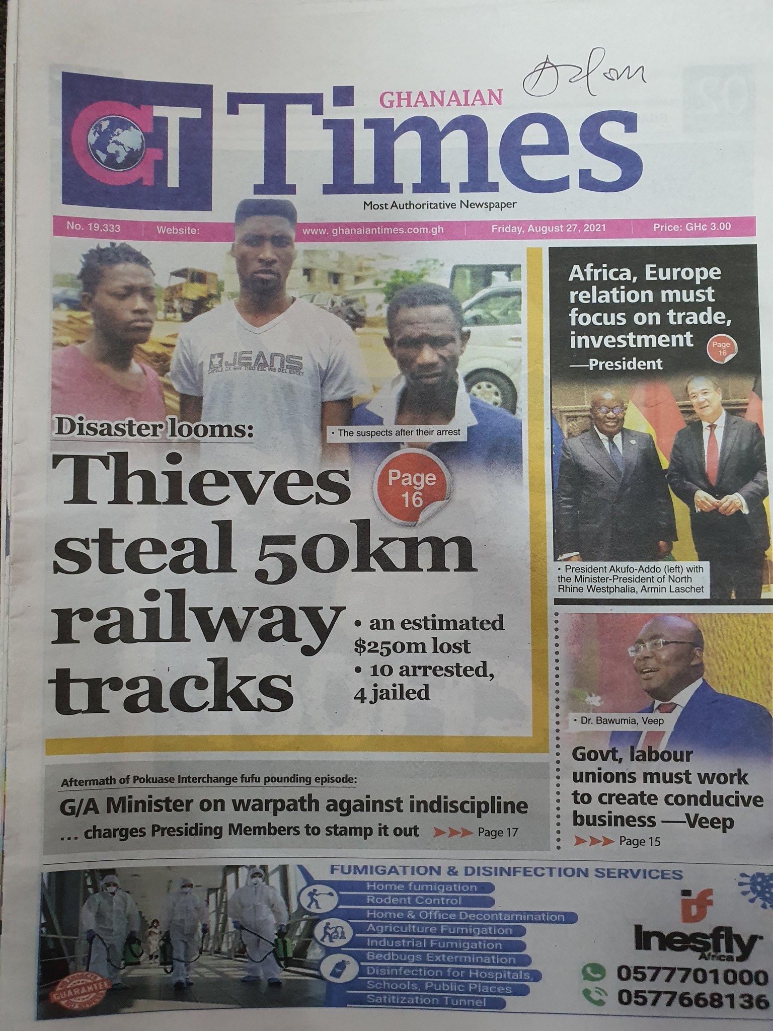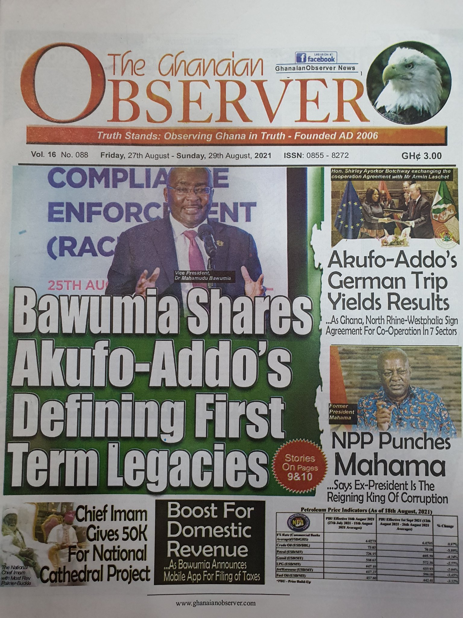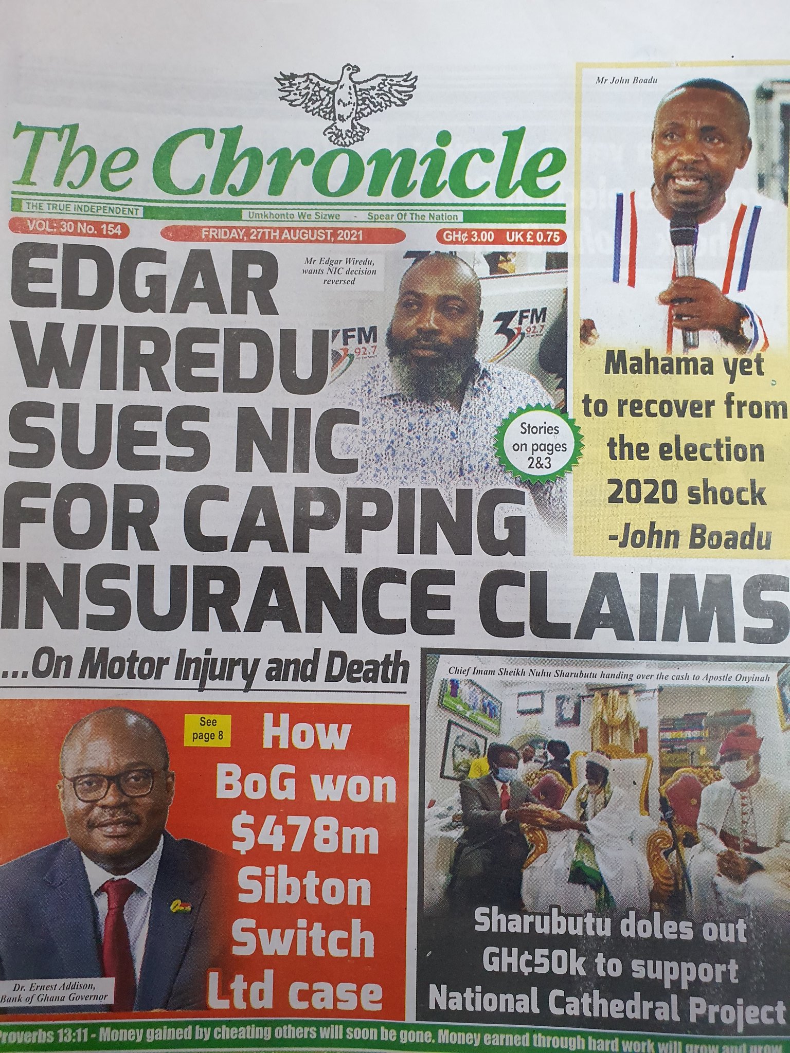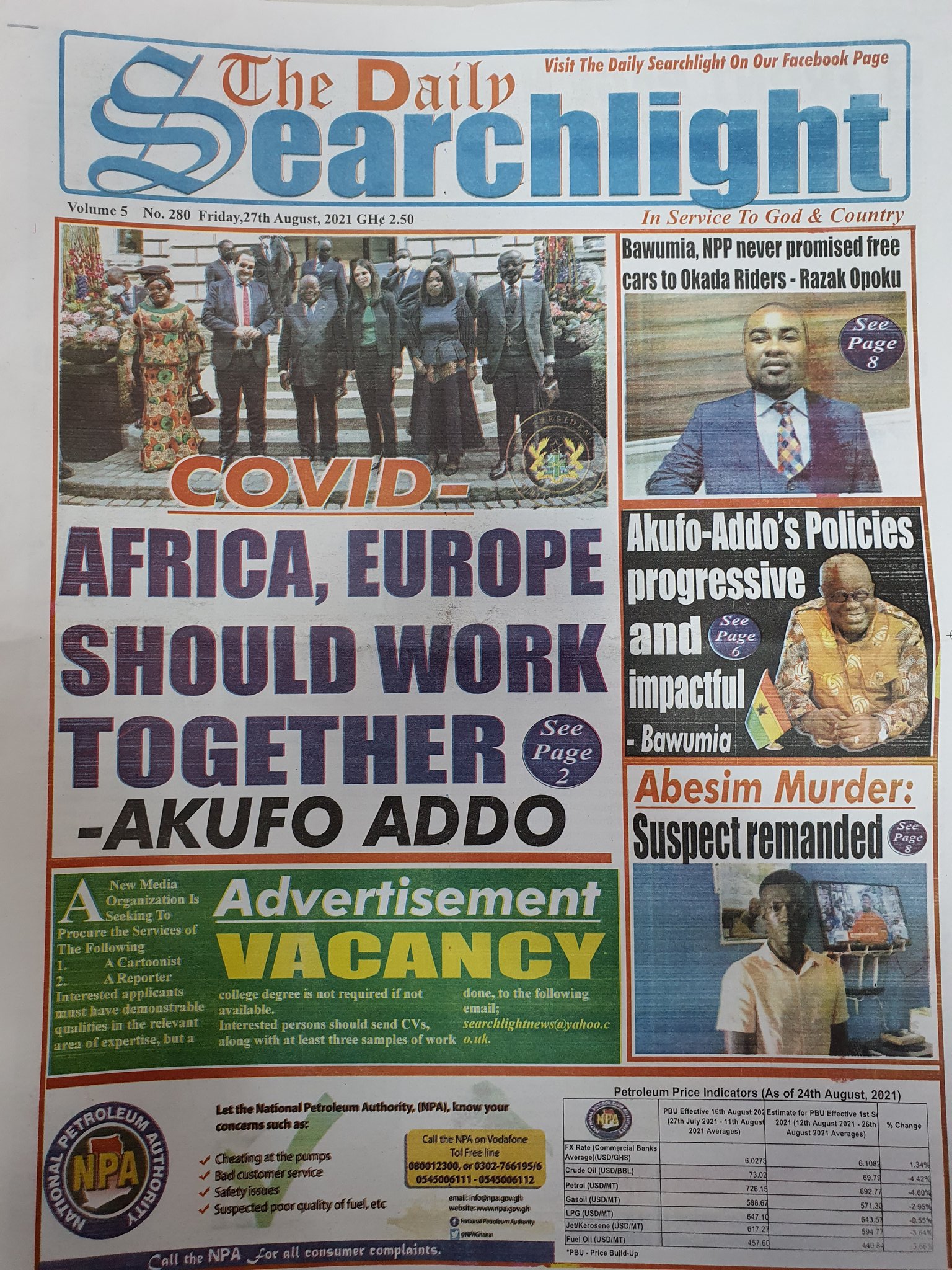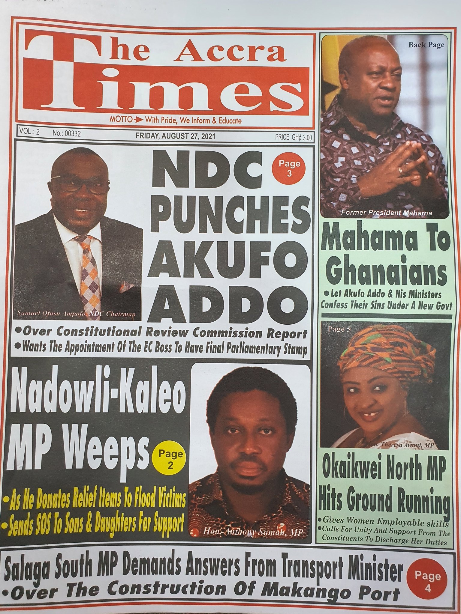 Newspaper headlines: Friday, August 27, 2021 Date: 27 August 2021 By Primenewsghana.com Category: general news Newspaper headlines Shares Share Tweet Email Share Here are the front pages of some of Ghana's newspapers today.