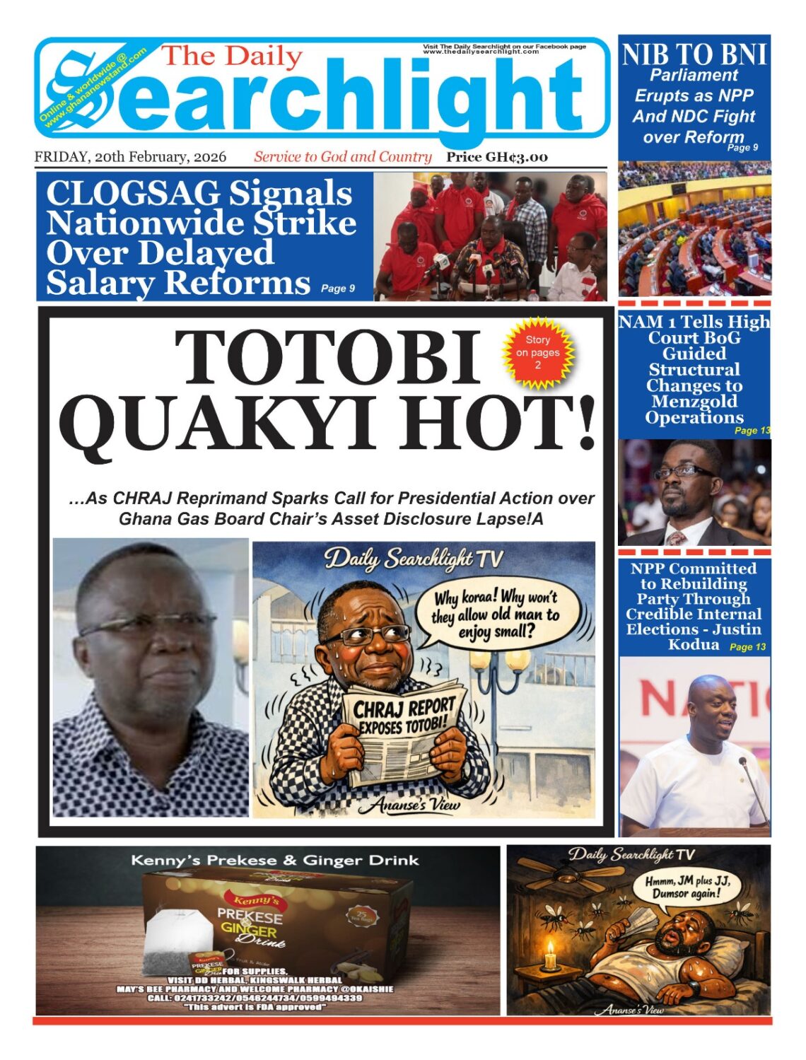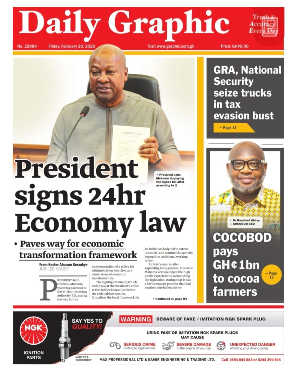 Newspaper headlines: Friday, February 20, 2026 Date: 20 February 2026 By Vincent Ashitey Category: general news Shares Share Tweet Email Share Here are the front pages of some of Ghana’s newspapers today.