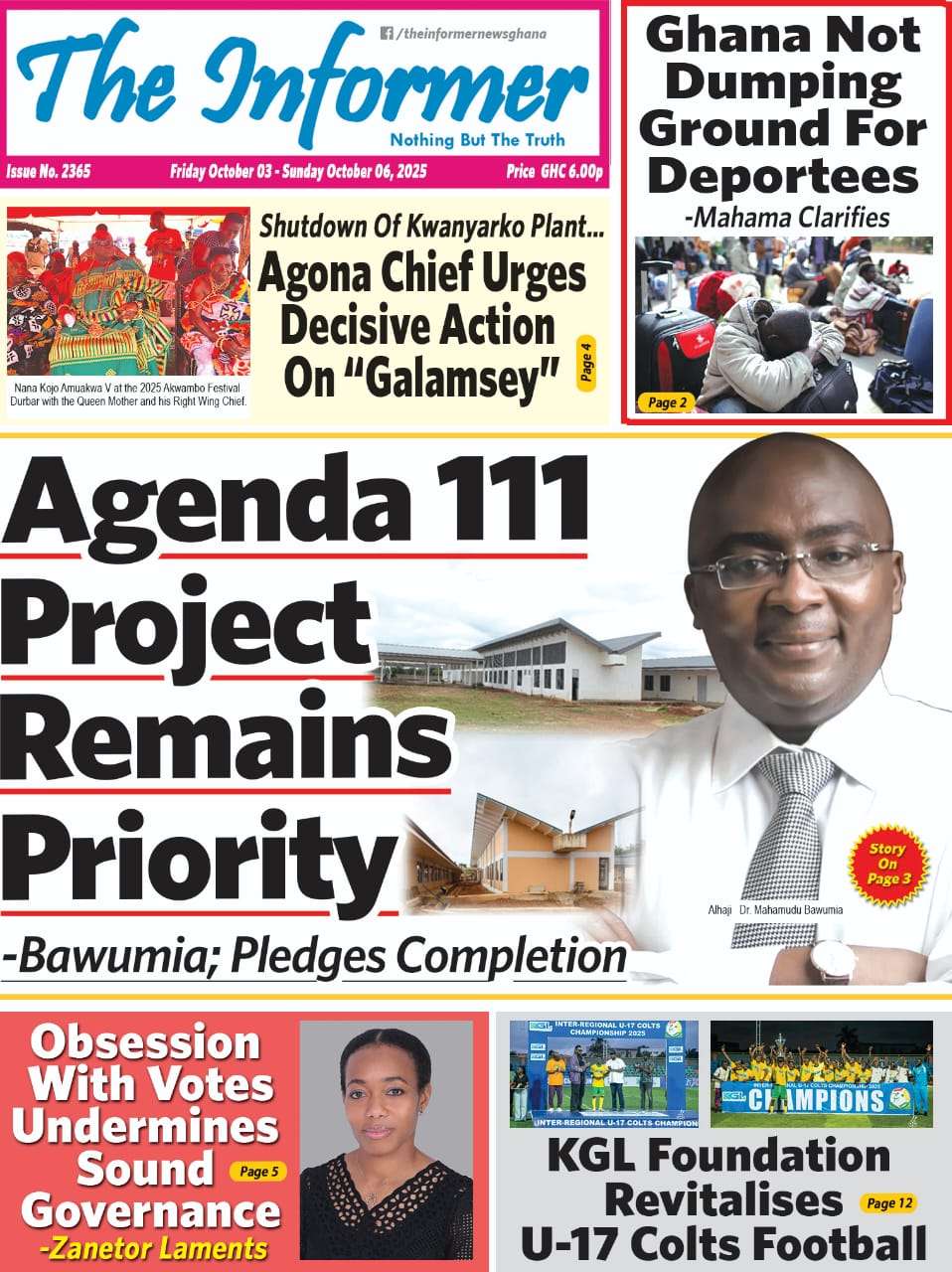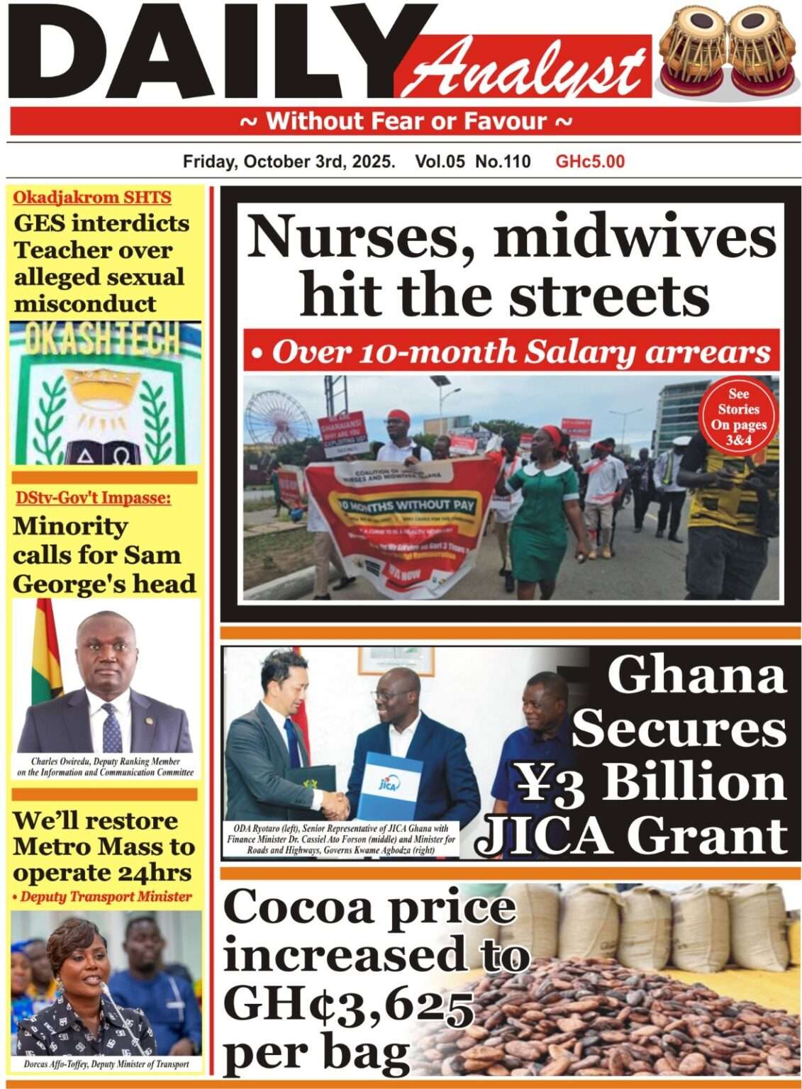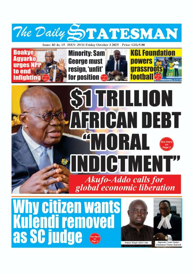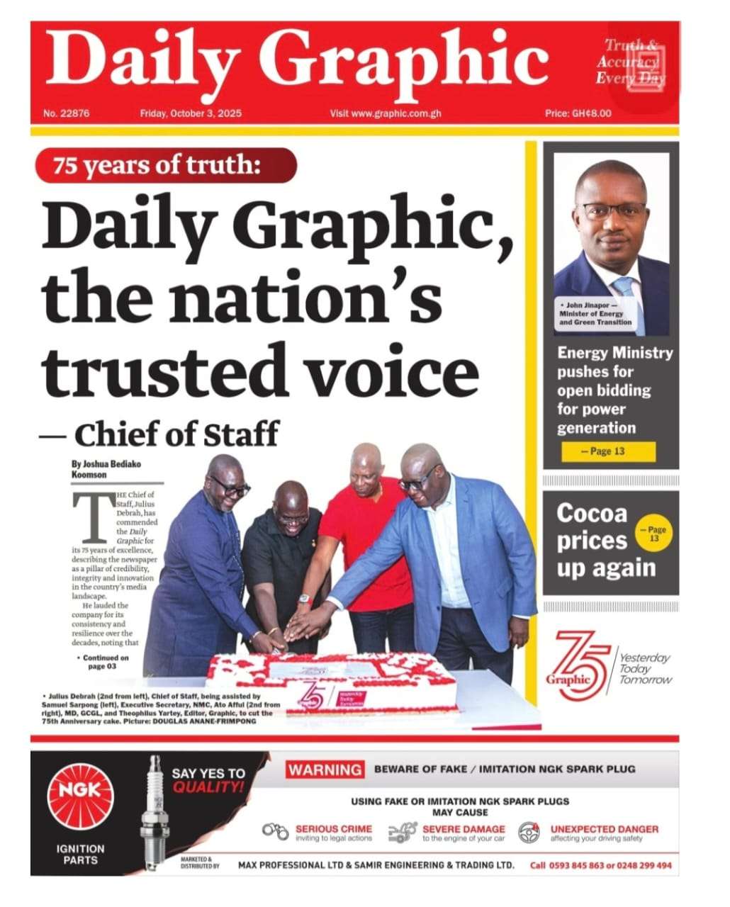 Newspaper headlines: Friday, October 3, 2025 Date: 03 October 2025 By Vincent Ashitey Category: general news Shares Share Tweet Email Share Here are the front pages of some of Ghana’s newspapers today.