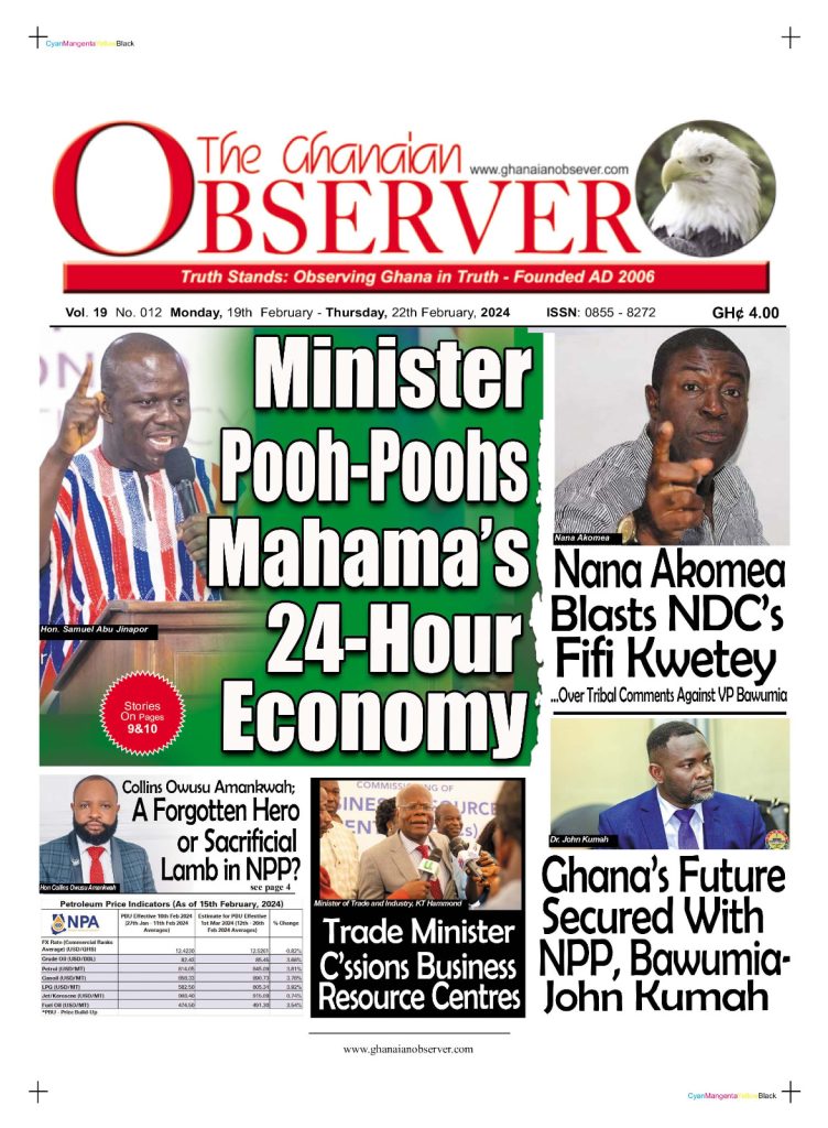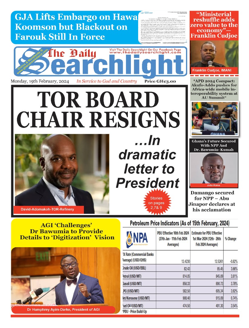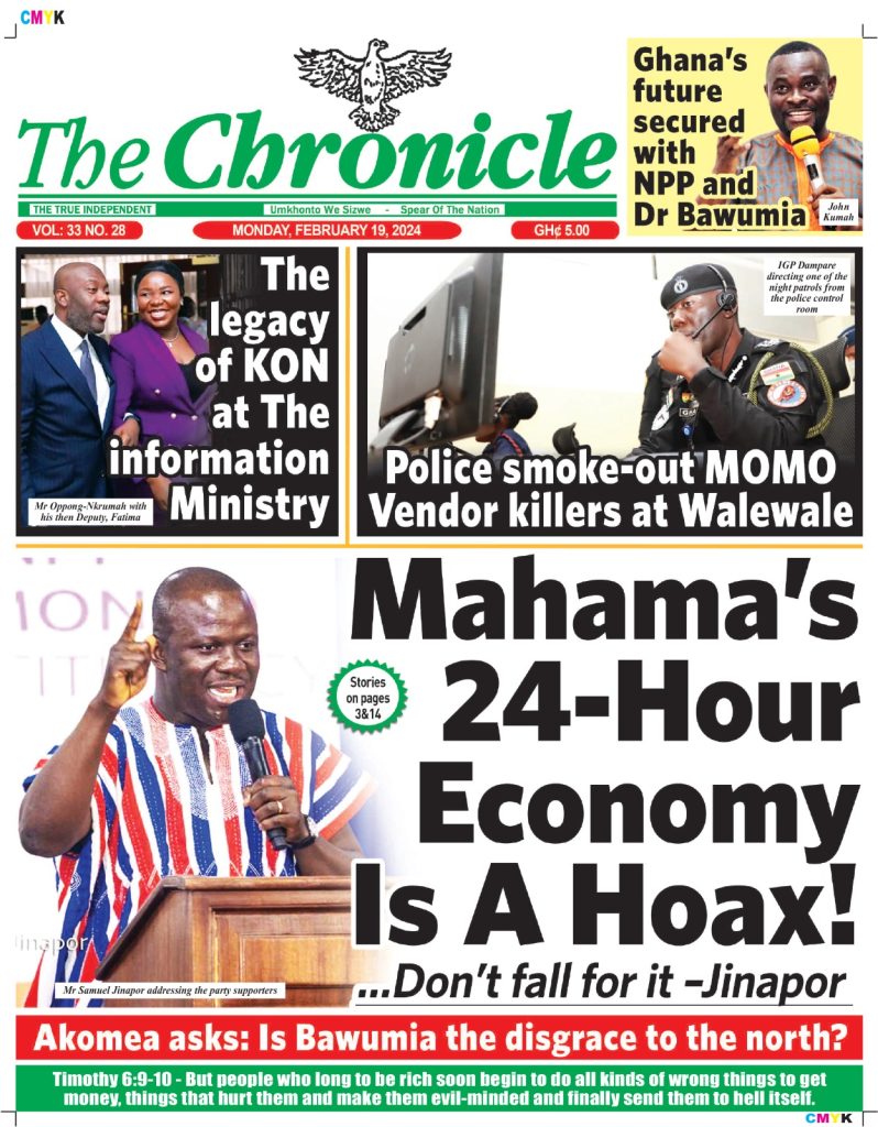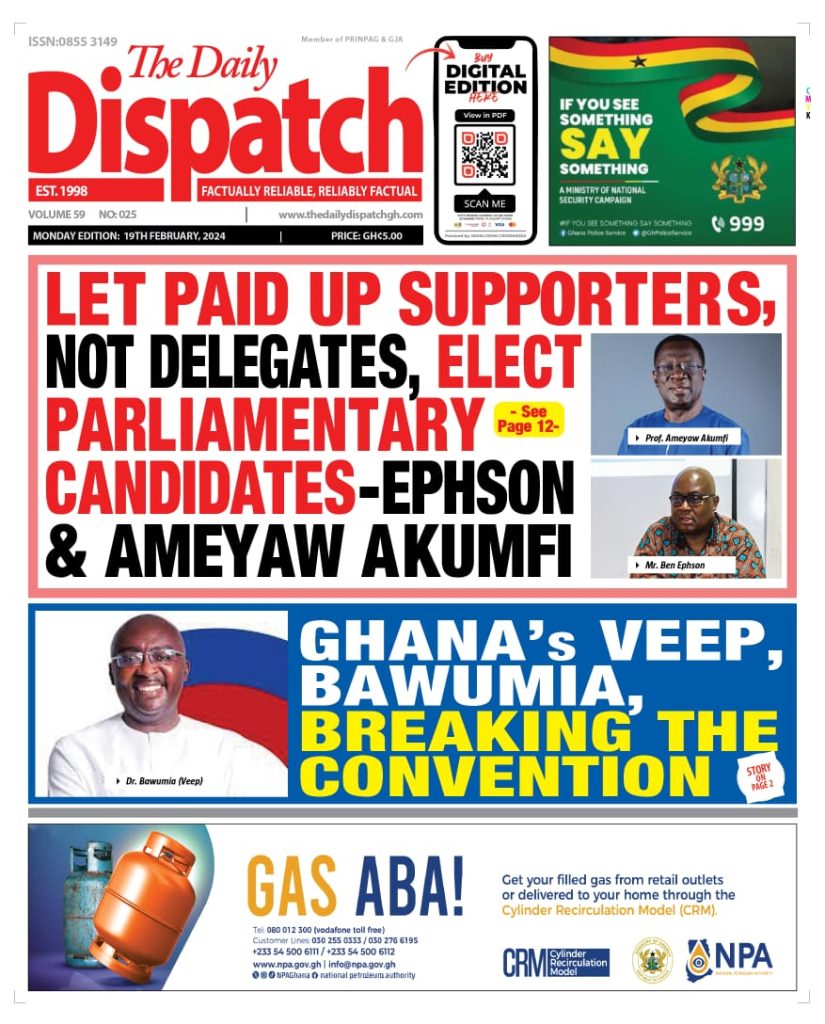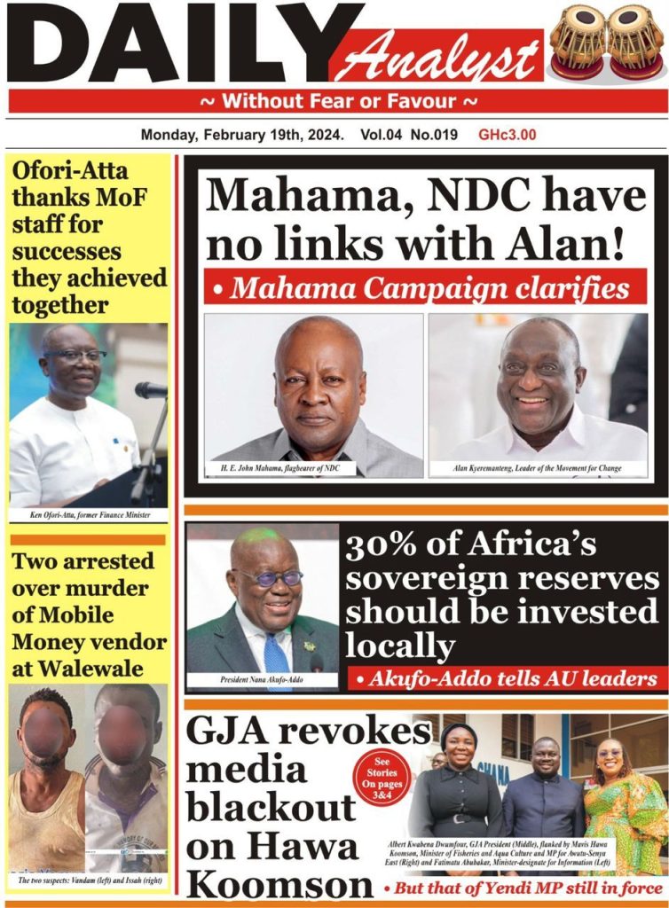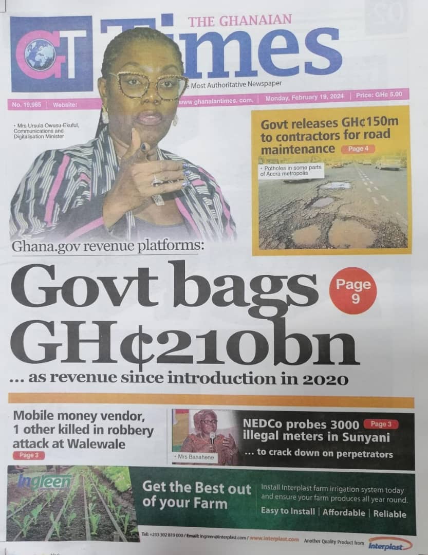 Newspaper headlines: Monday, February 19, 2024 Date: 19 February 2024 By Vincent Ashitey Category: general news Shares Share Tweet Email Share Here are the front pages of some of Ghana’s newspapers today.