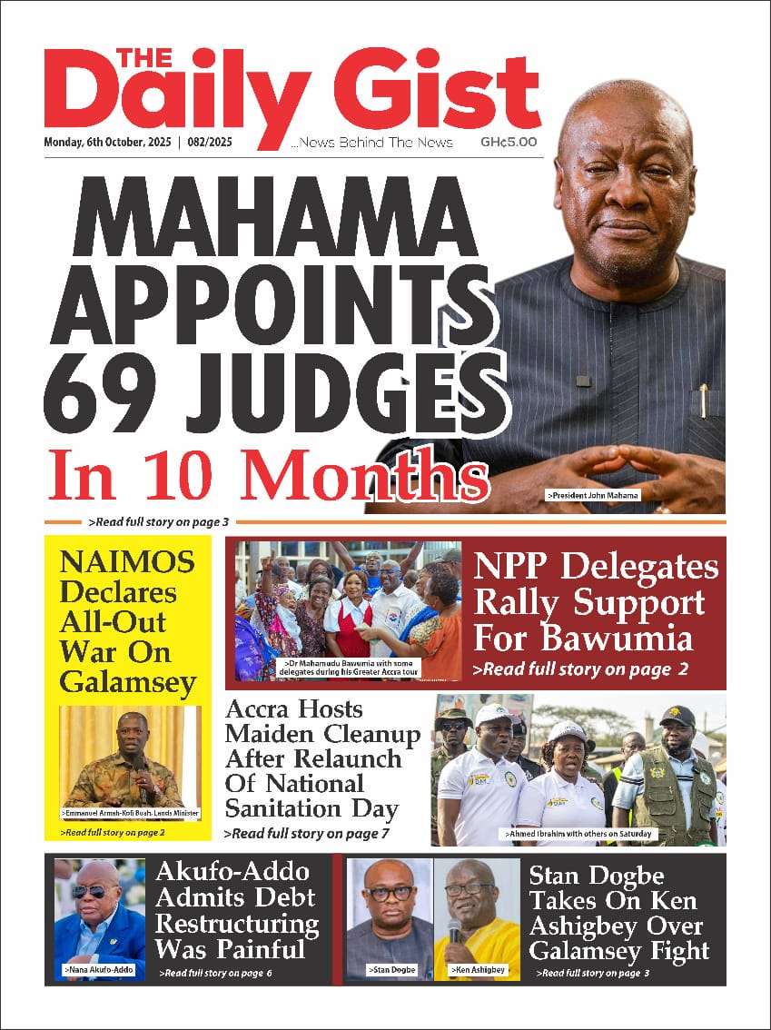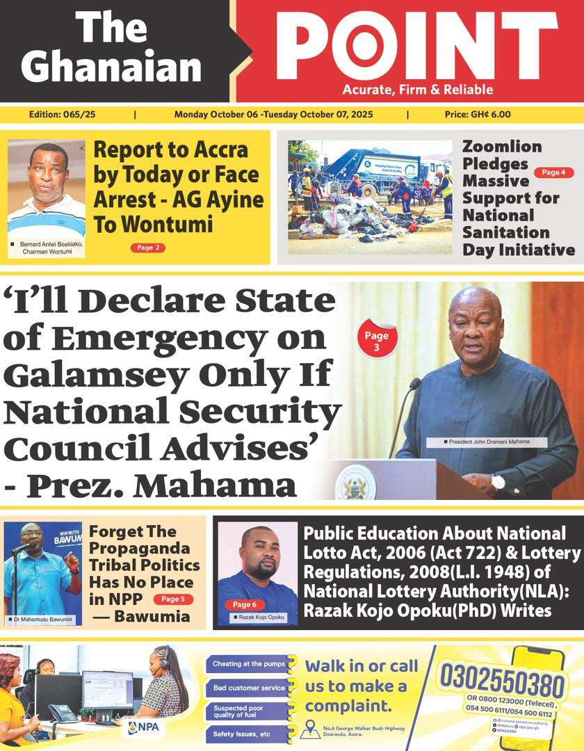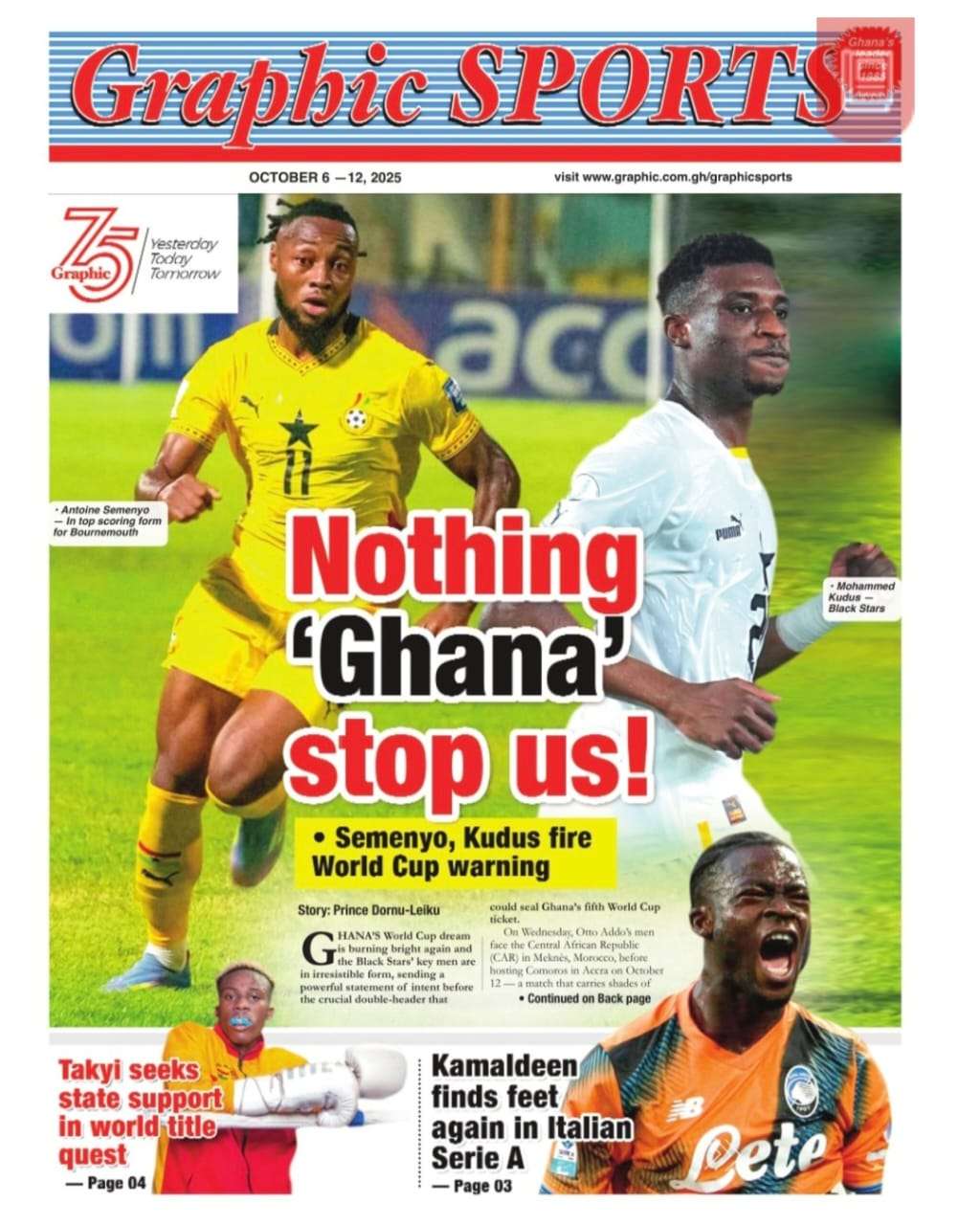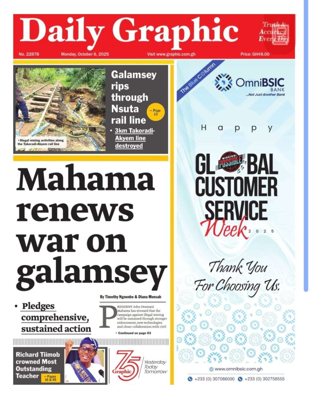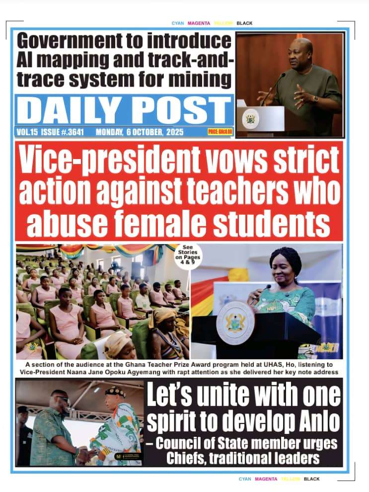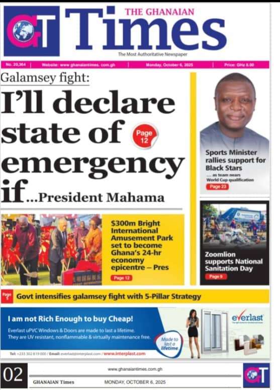 Newspaper headlines: Monday, October 6, 2025 Date: 06 October 2025 By Vincent Ashitey Category: general news Shares Share Tweet Email Share Here are the front pages of some of Ghana’s newspapers today.