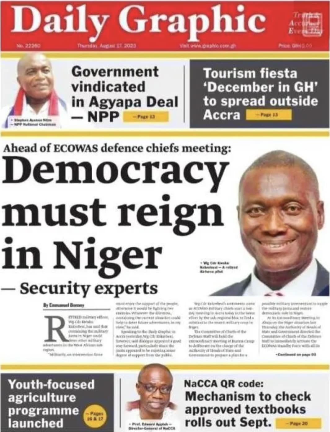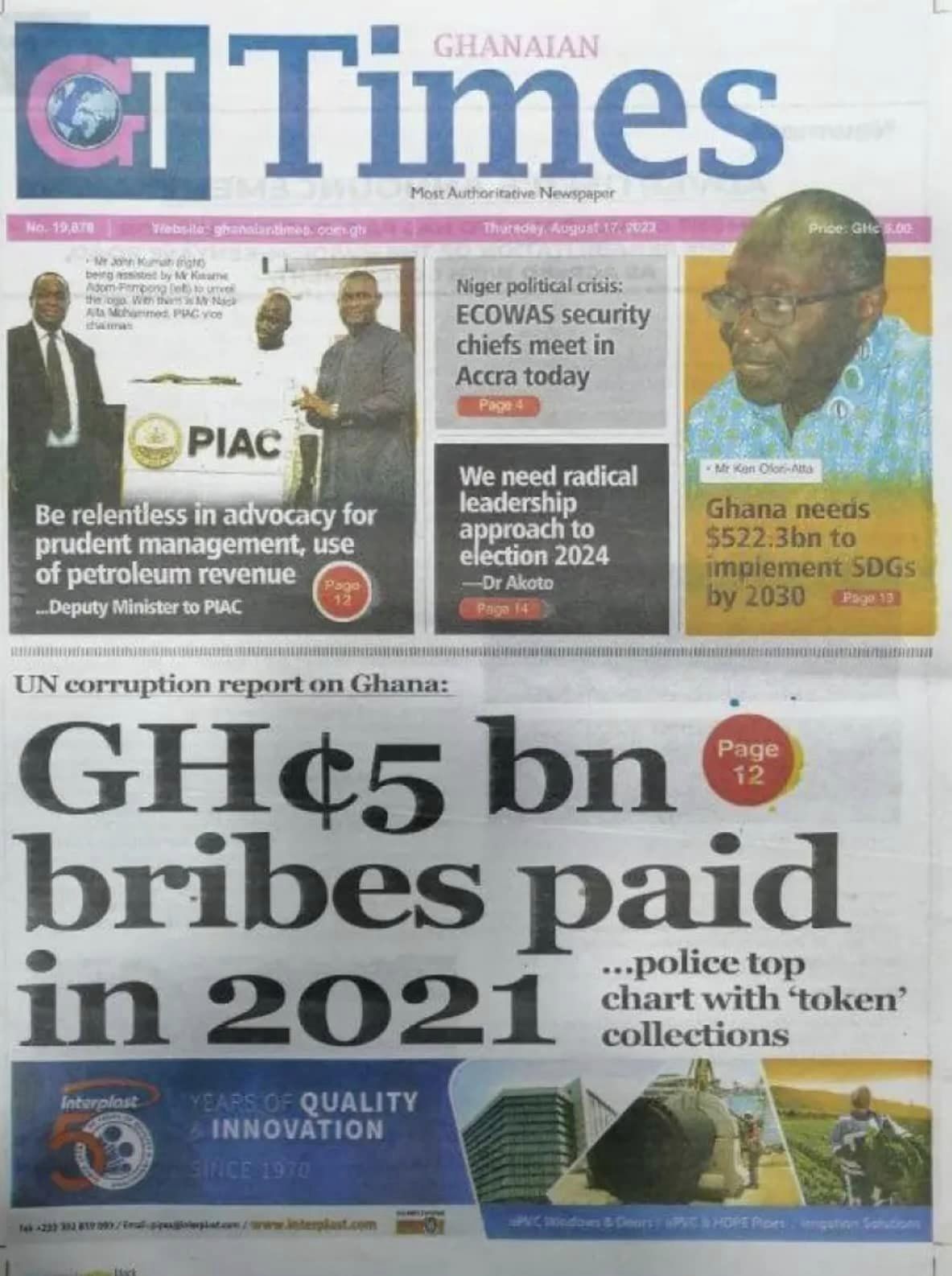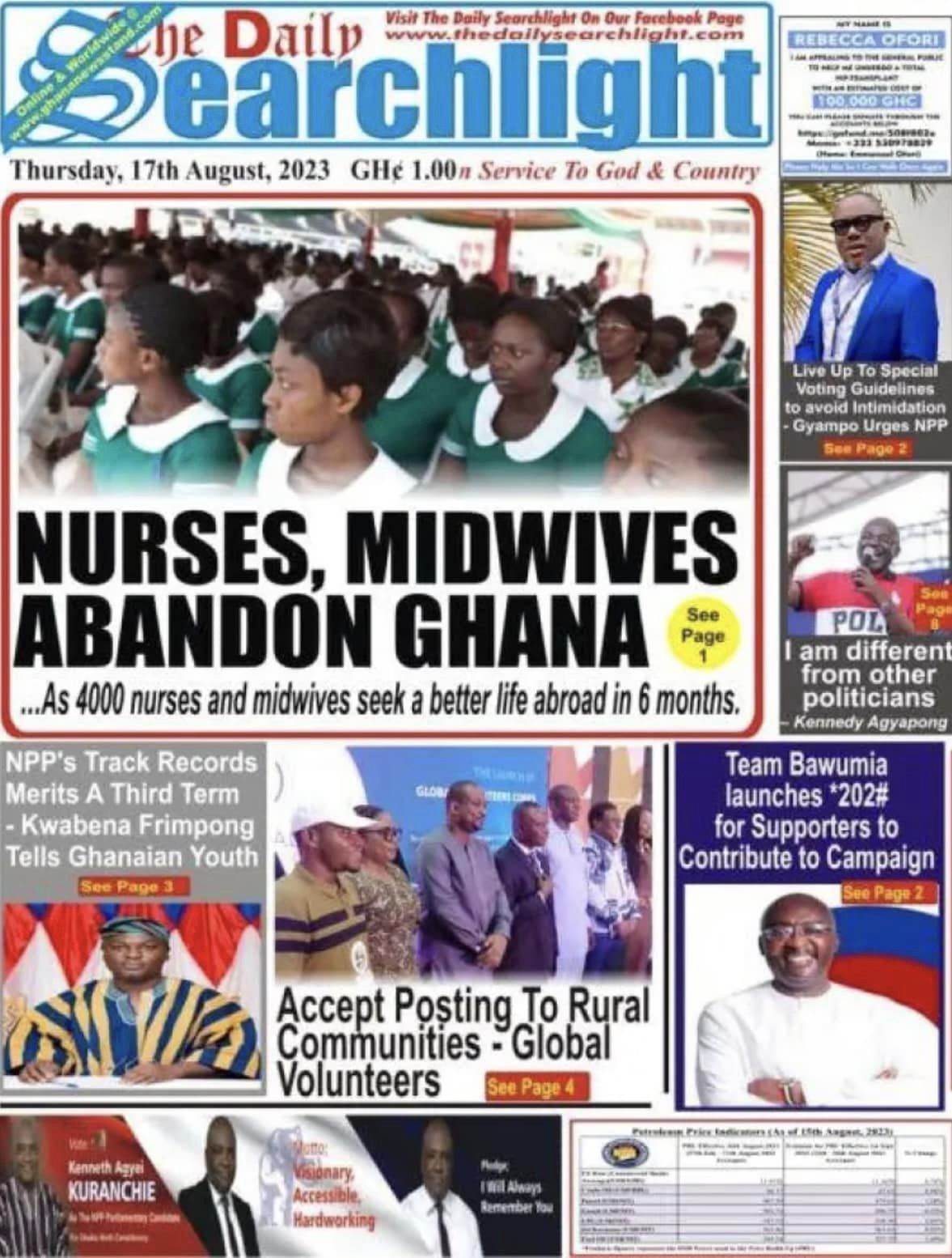 Newspaper headlines: Thursday, August 17, 2023 Date: 17 August 2023 By Vincent Ashitey Category: general news Shares Share Tweet Email Share Here are the front pages of some of Ghana’s newspapers today.