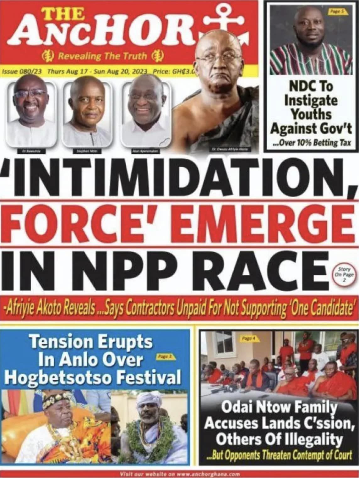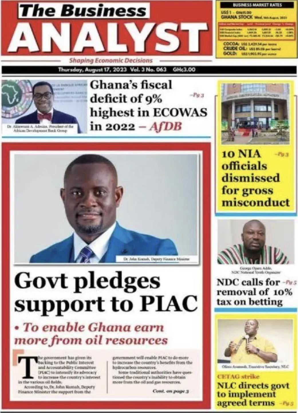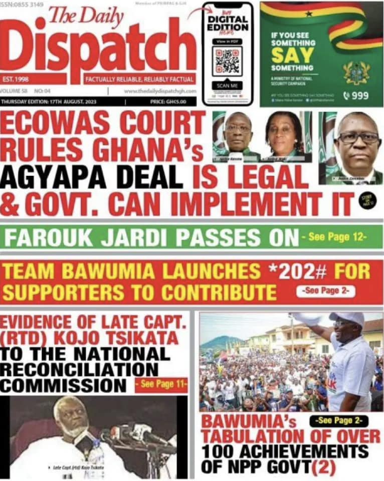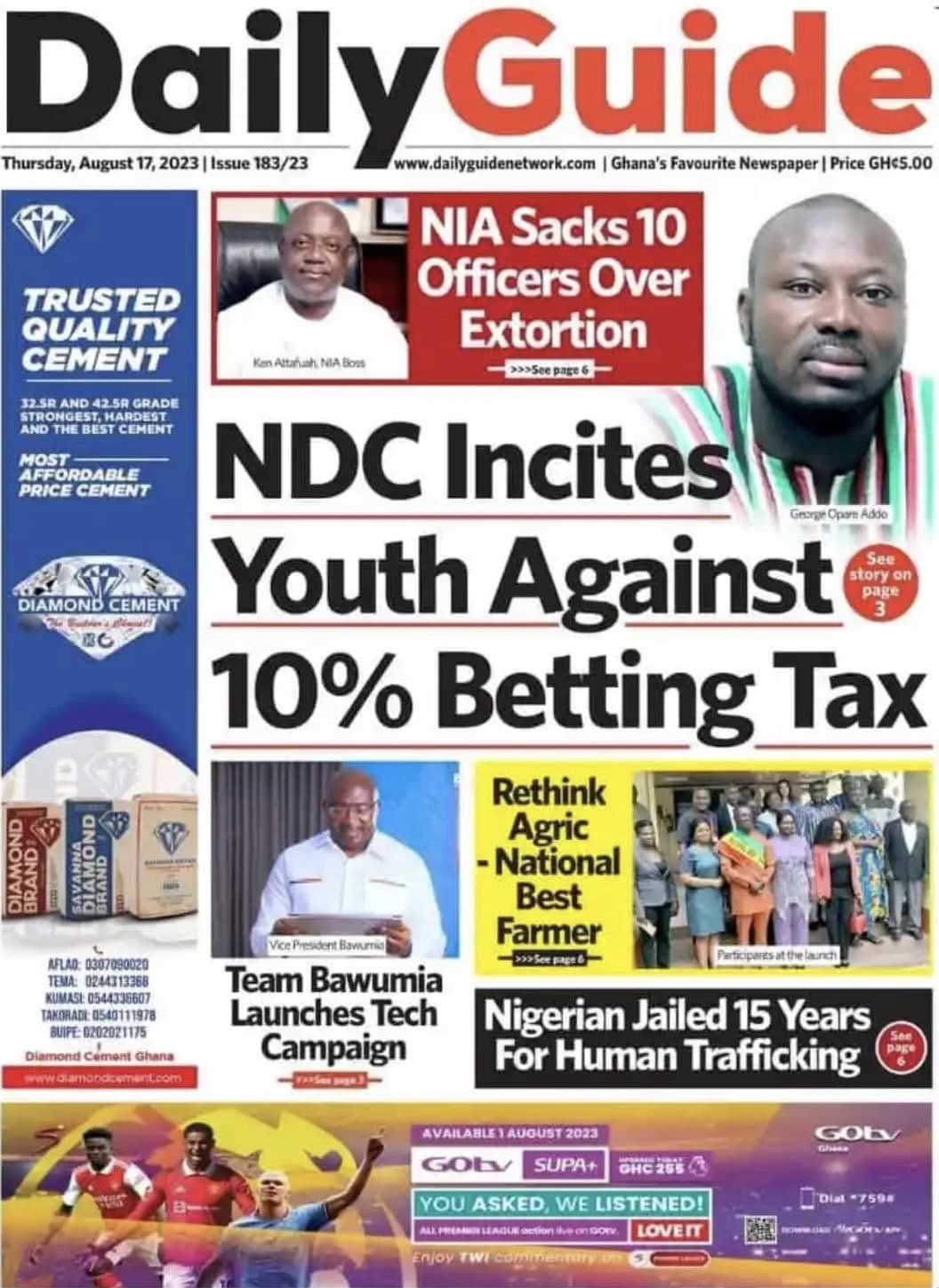 Newspaper headlines: Thursday, August 17, 2023 Date: 17 August 2023 By Vincent Ashitey Category: general news Shares Share Tweet Email Share Here are the front pages of some of Ghana’s newspapers today.