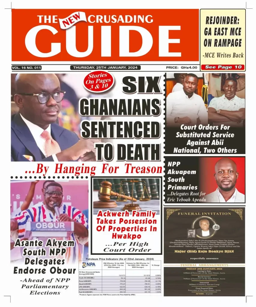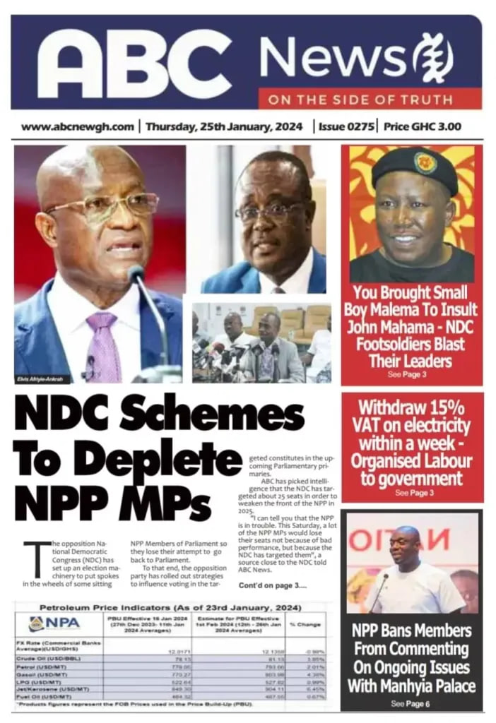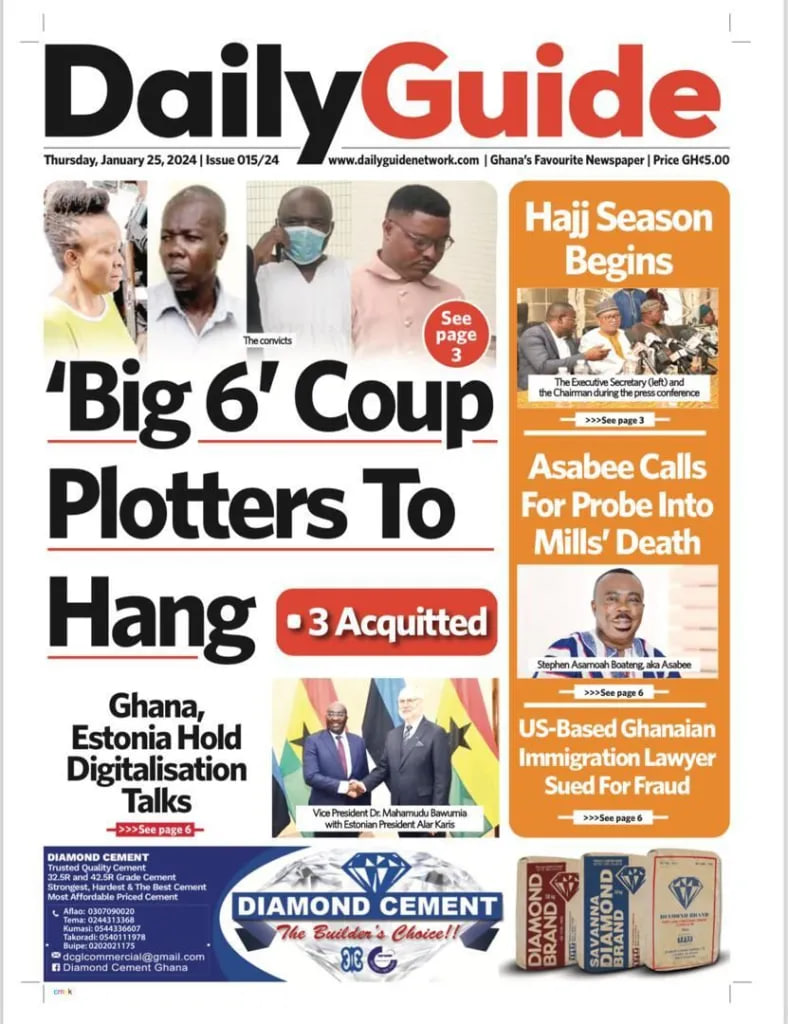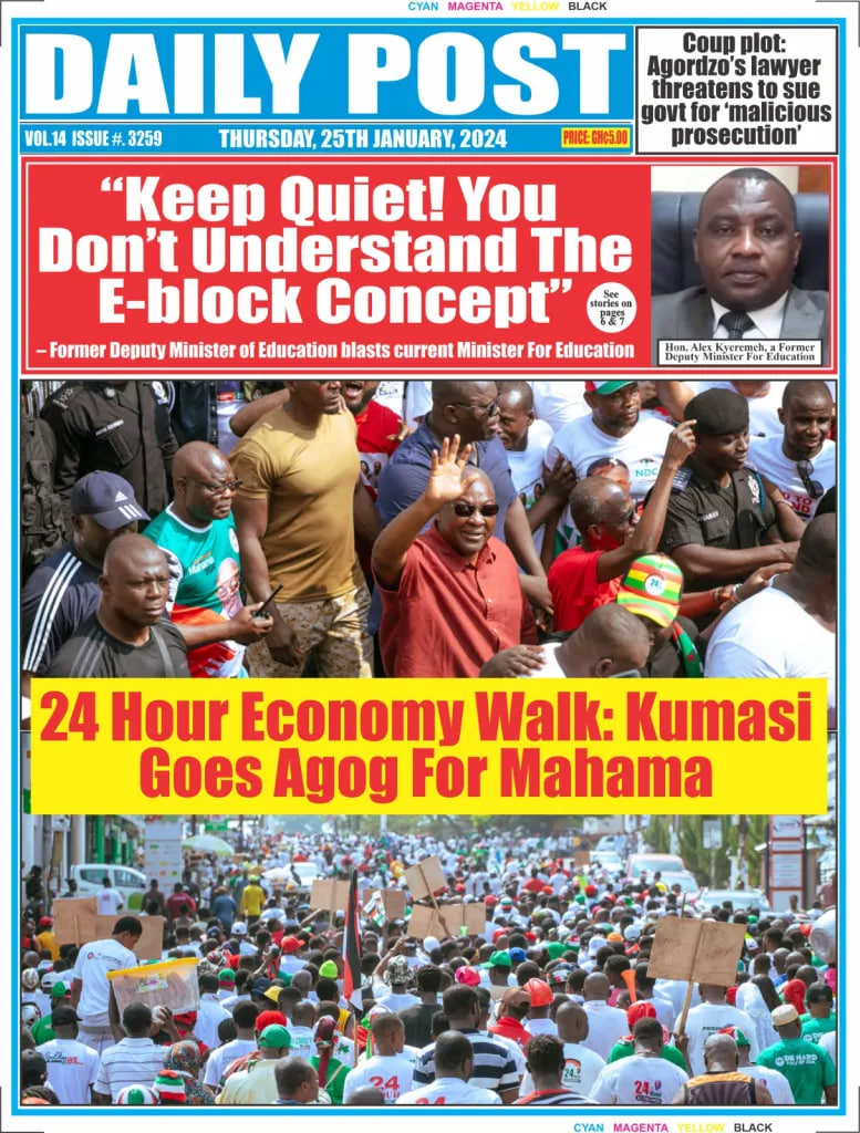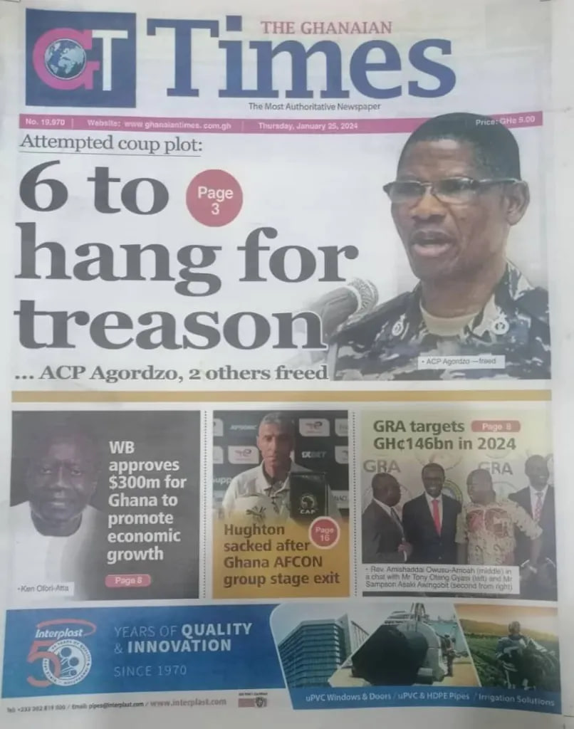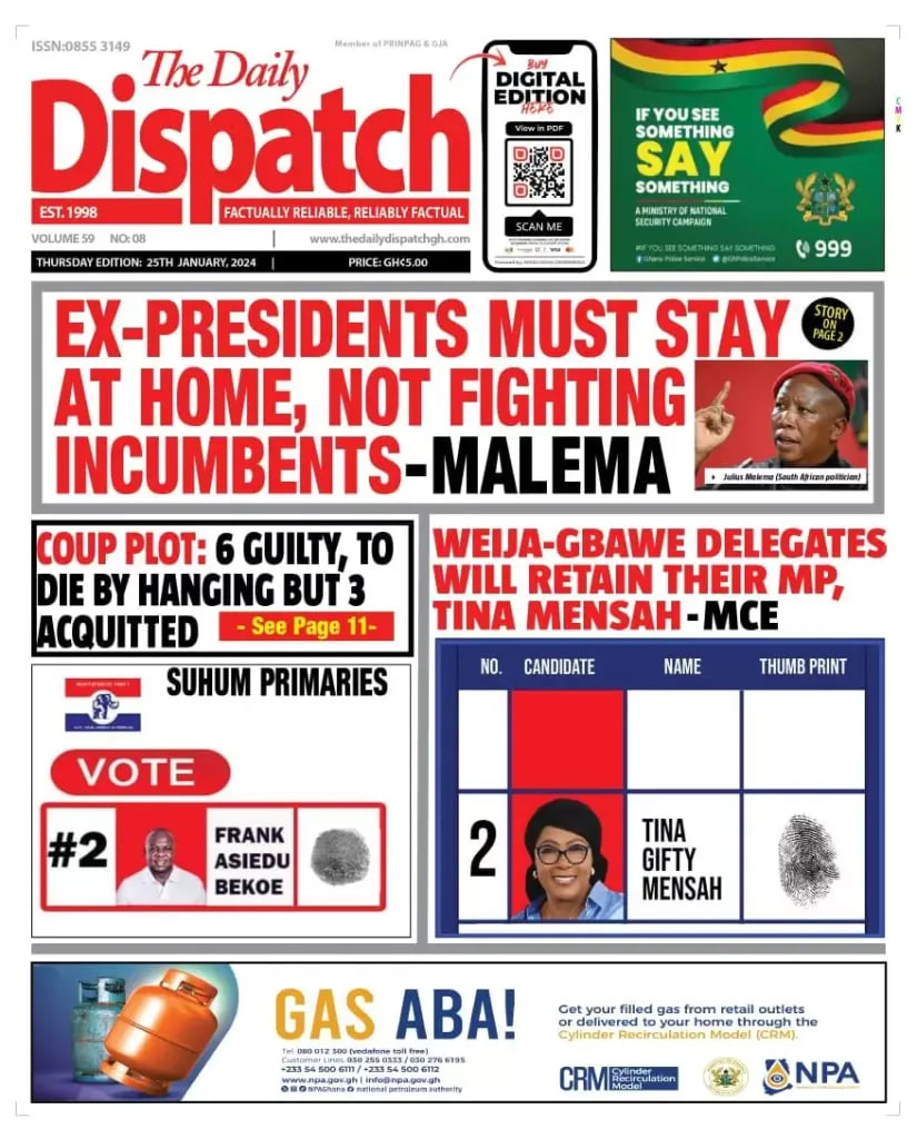 Newspaper headlines: Thursday, January 25, 2024 Date: 25 January 2024 By Vincent Ashitey Category: general news Shares Share Tweet Email Share Here are the front pages of some of Ghana’s newspapers today.