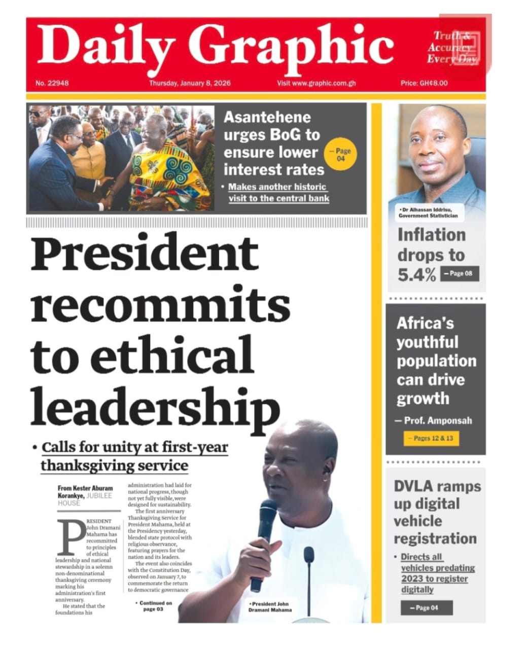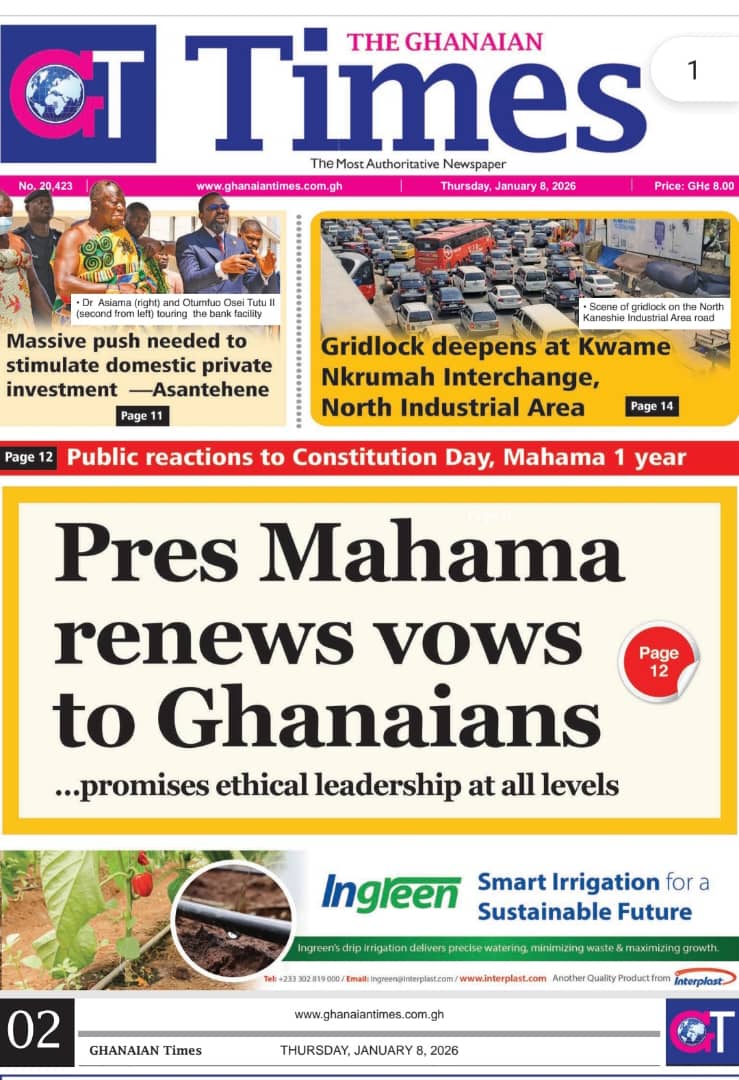 Newspaper headlines: Thursday, January 8, 2026 Date: 08 January 2026 By Vincent Ashitey Category: general news Shares Share Tweet Email Share Here are the front pages of some of Ghana’s newspapers today.