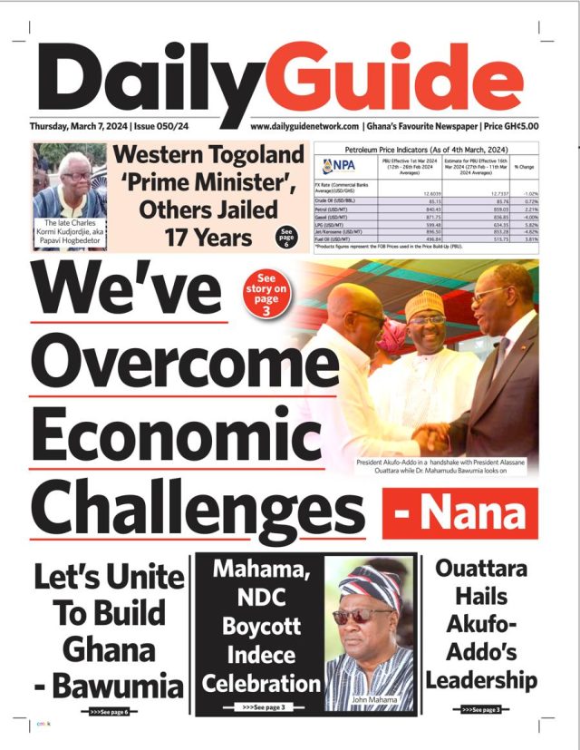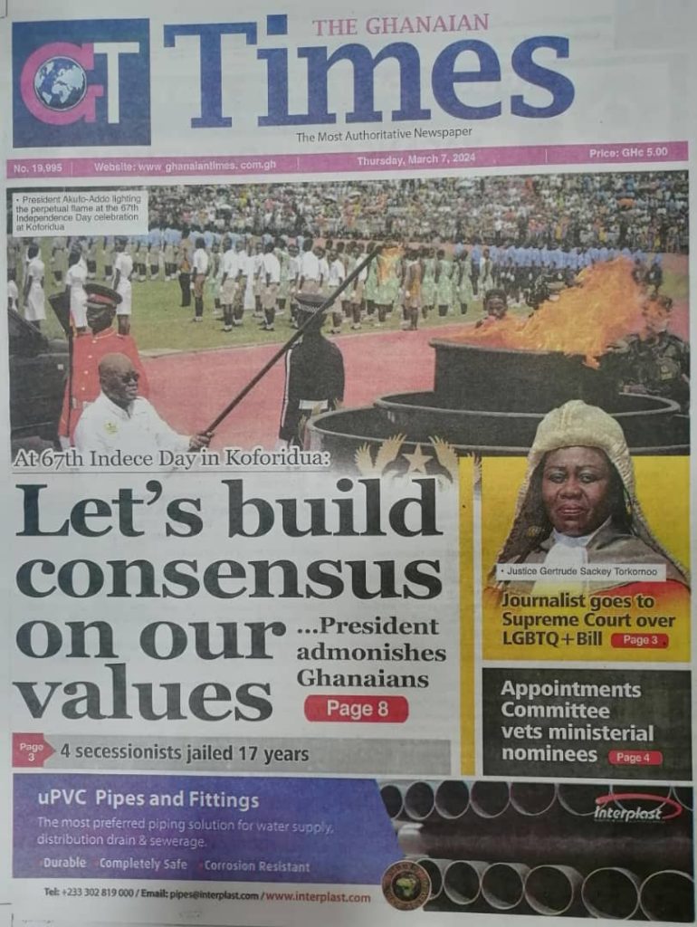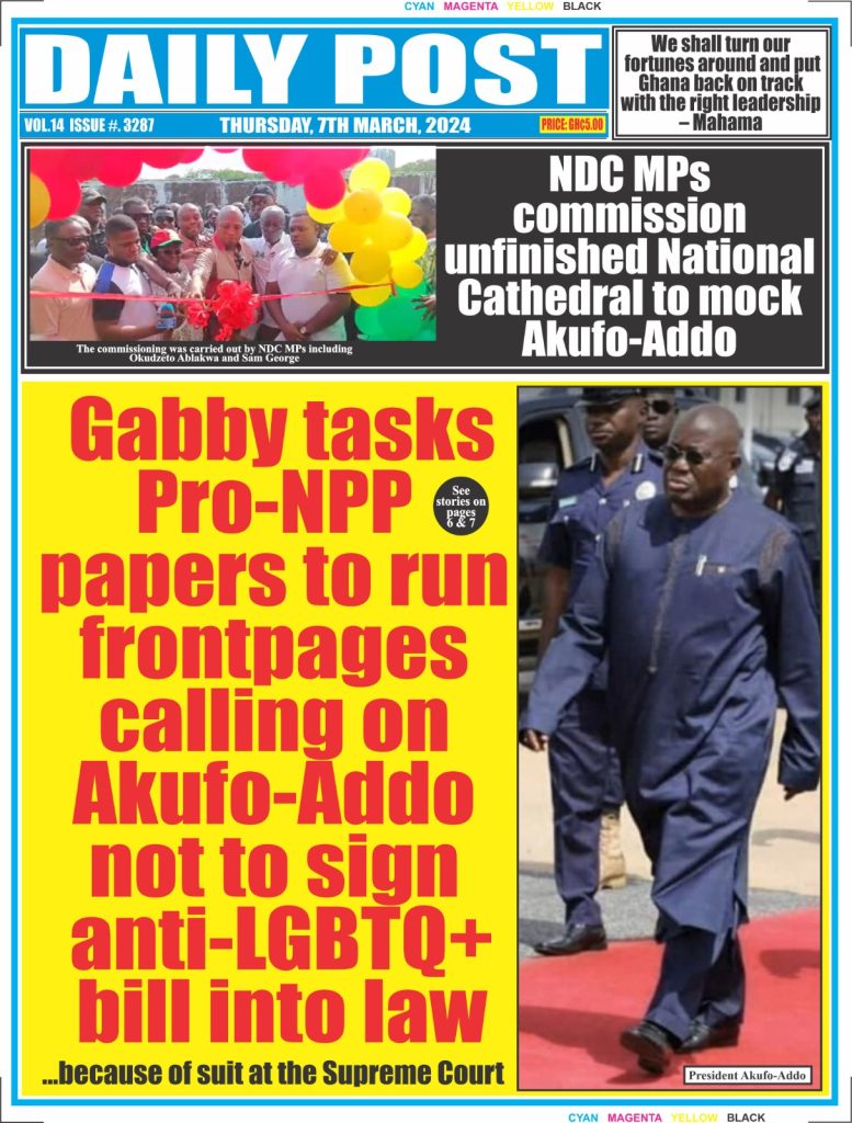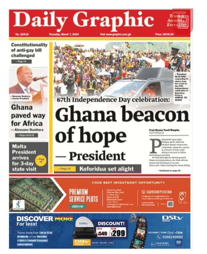 Newspaper headlines: Thursday, March 7, 2024 Date: 07 March 2024 By Vincent Ashitey Category: general news Shares Share Tweet Email Share Here are the front pages of some of Ghana’s newspapers today.