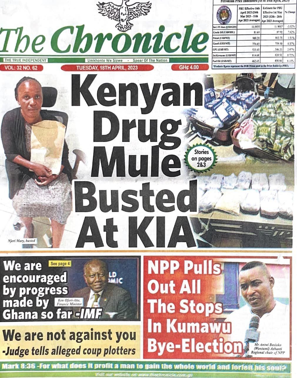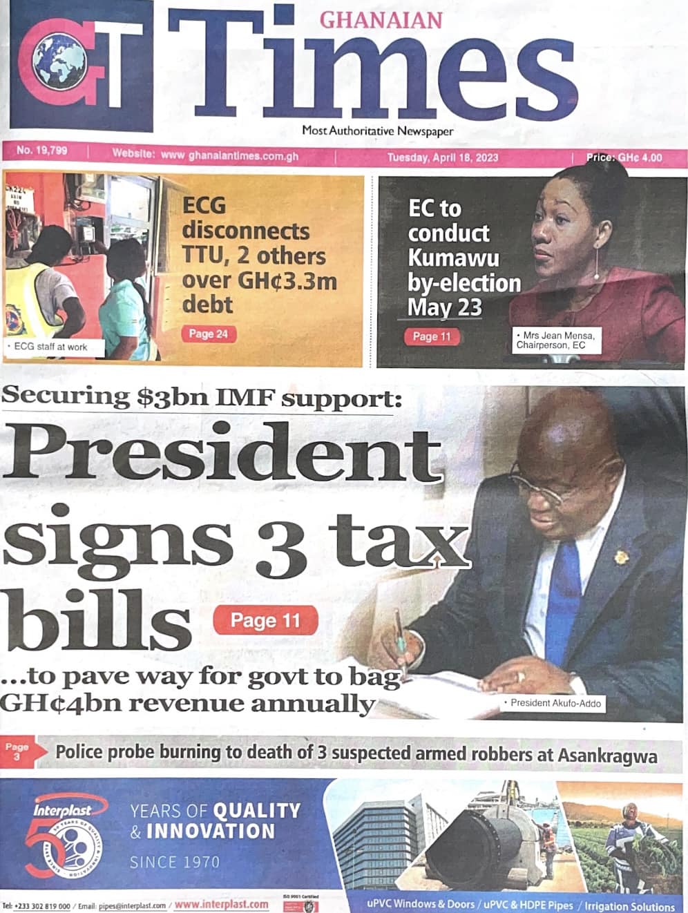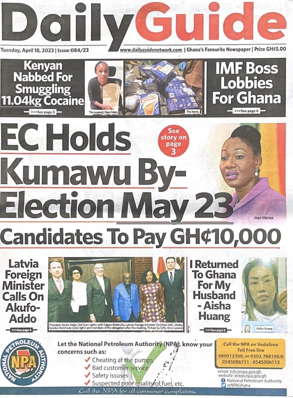 Newspaper headlines: Tuesday, April 18, 2023 Date: 18 April 2023 By Vincent Ashitey Category: general news Shares Share Tweet Email Share Here are the front pages of some of Ghana's newspapers today.