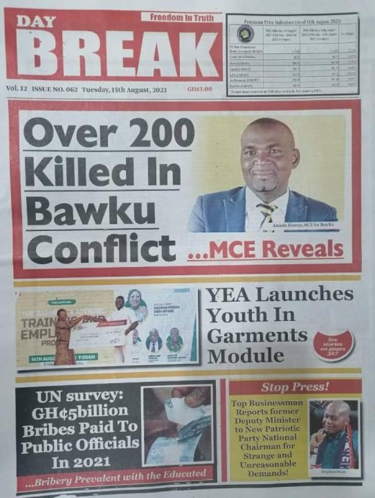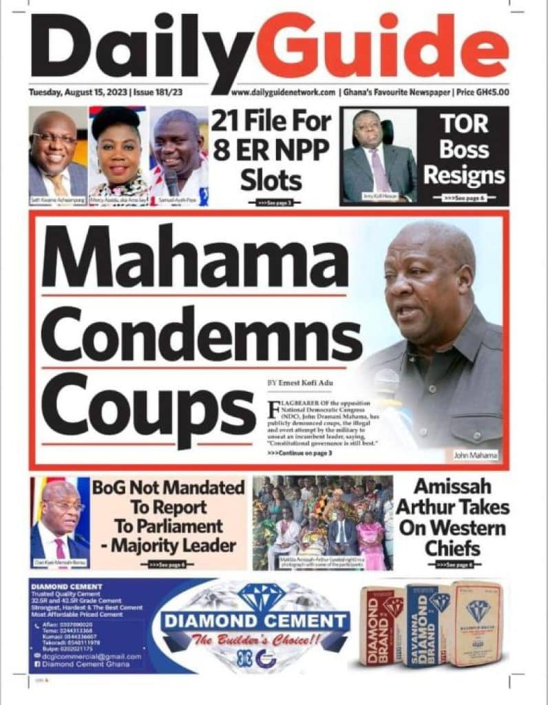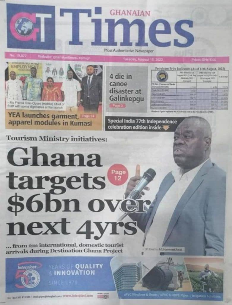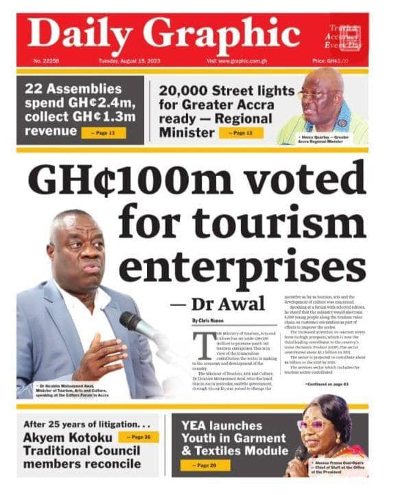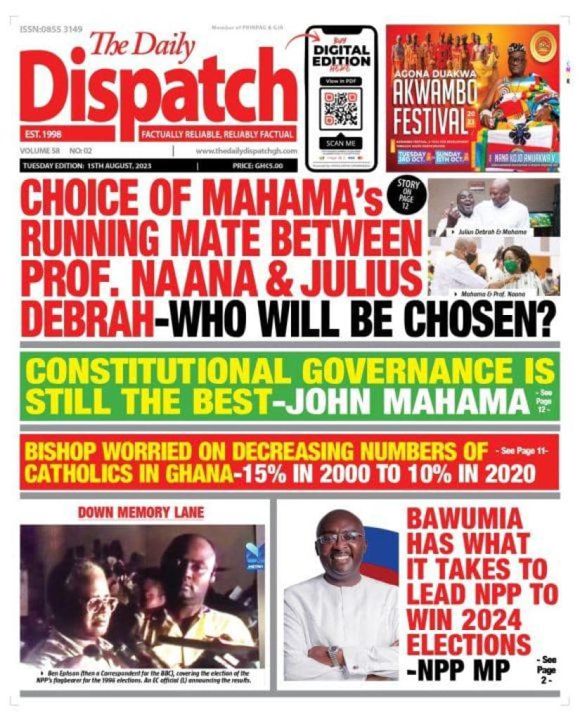 Newspaper headlines: Tuesday, August 15, 2023 Date: 15 August 2023 By Vincent Ashitey Category: general news Shares Share Tweet Email Share Here are the front pages of some of Ghana’s newspapers today. 5